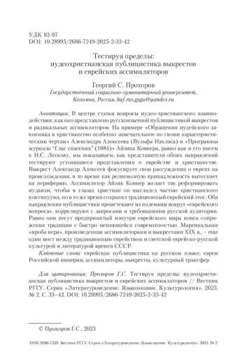 В центре статьи вопросы иудео-христианского взаимодействия, как оно представлено русскоязычной публицистикой выкрестов и радикальных ассимиляторов. На примере «Обращения иудейского законника в христианство особенно замечательное по своим характеристическим чертам» Александра Алексеева (Вульфа Нахласа) и «Программы журнала “Глас спасения” (1884)» Айзика Ковнера, равно как и его писем к Н. С. Лескову, мы показываем, как представители обоих направлений тестируют устоявшиеся представления о еврействе и христианстве. Выкрест Александр Алексеев фокусирует свои рассуждения о евреях на происхождении, в то время как религиозную принадлежность вытесняет на периферию. Ассимилятор Айзик Ковнер желает так реформировать иудаизм, чтобы в глазах христиан он выглядел частью христианского континуума, но в то же время сохранял традиционный еврейский этос. Оба направления публицистики проистекают из полемики вокруг «еврейского вопроса», коррелируют с запросами и требованиями русской аудитории. Равно они несут предпринятый изнутри еврейского мира поиск сопряжения традиции с быстро меняющейся современностью. Маргинальная «проба пера», произведенная ассимиляторами и выкрестами XIX в., – еще один мост между традиционным еврейством и светской еврейско-русской культурой и литературой времен СССР.