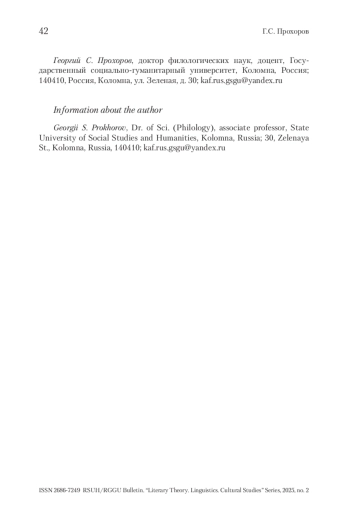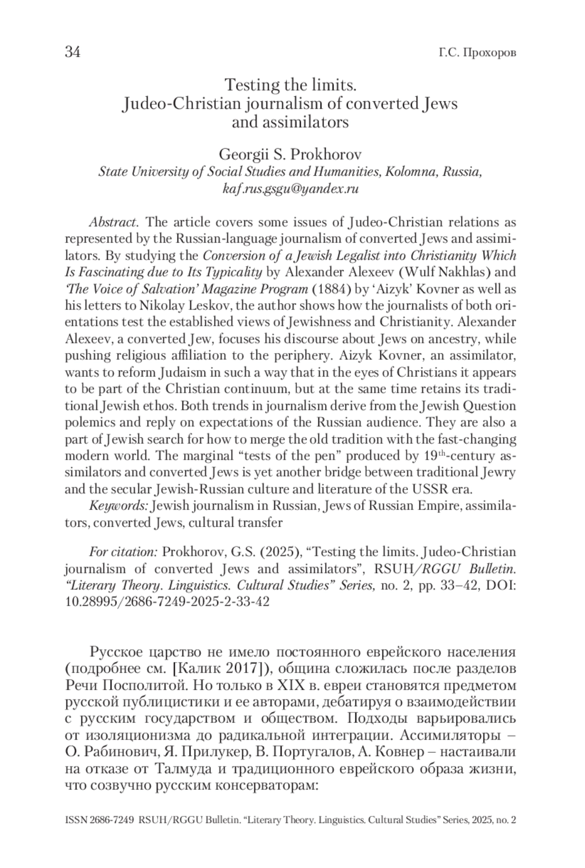 7. Прохоров 2021 - Прохоров Г.С. Еврейство после еврейства: Рудименты еврейской идентичности в мемуарах русских выкрестов конца XIX в. в свете современного опыта // Ежегодник еврейского евро-азиатского конгресса «Евреи Европы и Азии: состояние, перспективы, наследие». Т. 3: Сборник научных и публицистических статей / под ред. З. Ханина, В. Чернина, М. Гольда. Герцлия: Еврейский ун-т Иерусалима, 2021. С. 399-412.