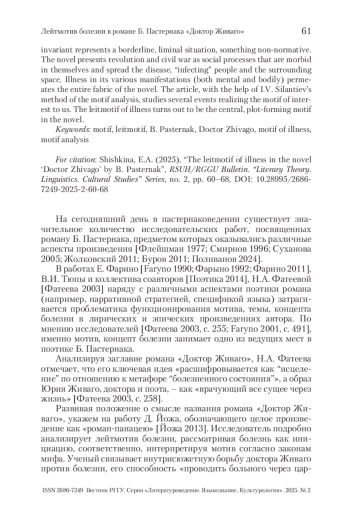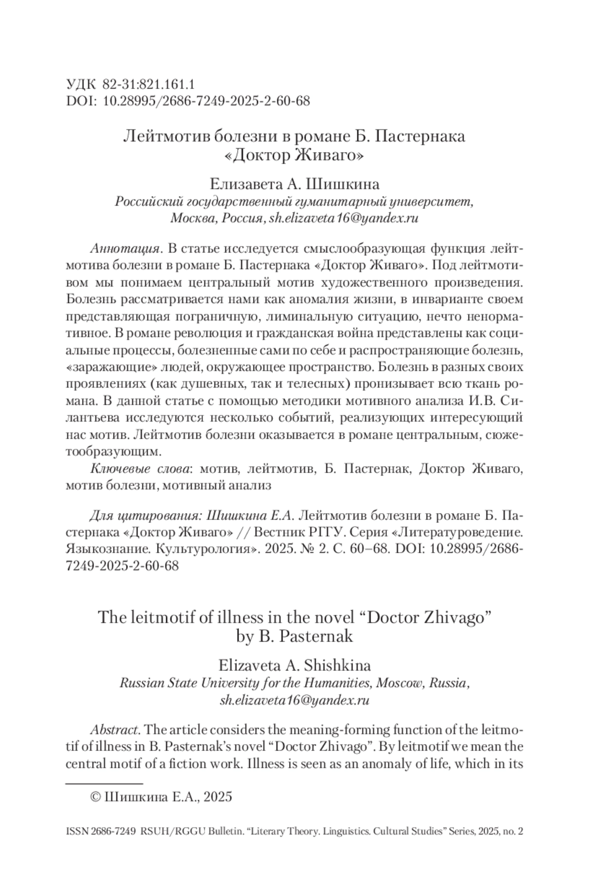 В статье исследуется смыслообразующая функция лейтмотива болезни в романе Б. Пастернака «Доктор Живаго». Под лейтмотивом мы понимаем центральный мотив художественного произведения. Болезнь рассматривается нами как аномалия жизни, в инварианте своем представляющая пограничную, лиминальную ситуацию, нечто ненормативное. В романе революция и гражданская война представлены как социальные процессы, болезненные сами по себе и распространяющие болезнь, «заражающие» людей, окружающее пространство. Болезнь в разных своих проявлениях (как душевных, так и телесных) пронизывает всю ткань романа. В данной статье с помощью методики мотивного анализа И. В. Силантьева исследуются несколько событий, реализующих интересующий нас мотив. Лейтмотив болезни оказывается в романе центральным, сюжетообразующим.