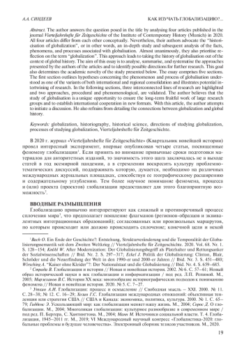 В основу данного материала положены четыре серийные статьи, вышедшие в течение 2020 г. в журнале «Квартальник новейшей истории» (Vierteljahrshefte für Zeitgeschichte) Института современной истории (Мюнхен–Берлин, Германия) и посвященные глобализации как «дискурсному конструкту». Их авторы – О. Бах, В. Кнёбль, Я. Экель, А. Виршинг – выступили за «историзацию глобализации» (углубленное изучение и включение в исторический оборот связанных с ней фактов, событий, явлений и процессов) и за приоритетность исследования имеющей собственную историю терминологической рефлексии глобализации, т. е. фактически попытались вывести историю глобализации из контекста глобальной истории. Концептуально и содержательно все четыре статьи отличаются друг от друга. Цель этой статьи, обусловившая ее научную новизну, состоит в анализе, обобщении и систематизации представленных подходов, в определении возможных направлений дальнейшего исследования. Структурно она состоит из пяти разделов. Автором детализированы гипотезы в отношении феномена и процесса глобализации (одного из вариантов сплочения мира и его отдельных регионов), показаны возможные (перспективные) переплетения исторических сюжетов. Были выделены три взаимосвязанных направления и два подхода (процессуальный и феноменологический), на основании изучения которых был сделан вывод, что изучение глобализации следует рассматривать как уникальный шанс обеспечить длительную плодотворную работу больших коллективов, наладить международное сотрудничество в новых расширенных форматах, уточнить и (или) обосновать практическую значимость проводимых исторических исследований широкого тематического спектра. Статья носит дискуссионный характер. В силу замысла (анализ тематического спектра статей журнала «Vierteljahrshefte für Zeitgeschichte») автор вынужден отказаться от обсуждения вопроса о месте истории глобализации в предметном комплексе глобальной истории