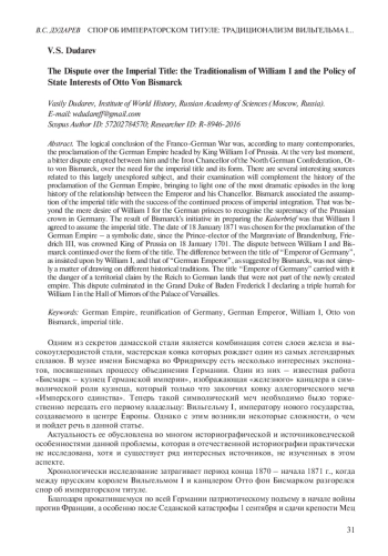 Логичным окончанием Франко-германской войны, по мнению многих современников, стало провозглашение Германской империи во главе с прусским королем Вильгельмом I. В самый последний момент между ним и «железным» канцлером Северогерманского союза Отто фон Бисмарком разгорелось нешуточное противостояние о необходимости принятия императорского титула и его именования. Эта проблема мало изучена в отечественной историографии. Существует ряд интересных источников, исследование которых дополняет историю провозглашения Германской империи, раскрывает причины одного из самых драматичных сюжетов многолетней истории взаимоотношений императора и канцлера. Бисмарк связывал принятие императорского титула с успехом продолжения процесса имперской интеграции. Это было важнее простого стремления Вильгельма I к признанию германскими князьями превосходства прусской короны в Германии. Итогом проявленной Бисмарком инициативы по подготовке «Императорского письма» стало согласие Вильгельма I на принятие императорского титула. Датой провозглашения прусского короля Вильгельма германским императором было выбрано 18 января 1871 г., что символично, поскольку 18 января 1701 г. состоялась коронация курфюрста Бранденбурга Фридриха III королем Пруссии. Спор между Вильгельмом I и Бисмарком продолжился из-за именования титула. Разница между титулом «император Германии», на чем настаивал Вильгельм I, и титулом «германский император», что предлагал Бисмарк, заключалась не только в использовании разных исторических традиций. Титул «император Германии» заключал в себе опасность территориальной претензии рейха на не входящие в создаваемую империю немецкие земли. Кульминацией этого спора стало провозглашение великим герцогом Баденским Фридрихом I троекратного «ура» Вильгельму I в Зеркальном зале Версальского дворца. В итоге был принят титул «германский император»