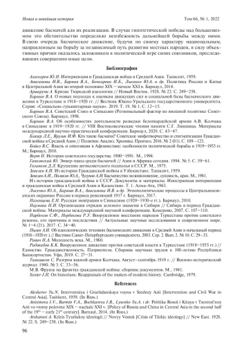 Общие сюжеты истории басмаческого движения, участники которого боролись против советской власти в Туркестане с 1918 г. и до второй половины 1930-х годов ХХ в., исследованы сравнительно полно. Но при этом в большей части публикаций, посвященных этой проблеме, акцент делается на анализе причин, определивших возникновение движения, характеристике его социальной базы, основных задачах и этапах. Значительно меньшее внимание уделяется вопросам, раскрывающим конечные цели основных союзников басмачей в борьбе с большевизмом в Туркестане, и тому, какое место в достижении подобных целей отводилось этому движению. Между тем это актуальная и значимая проблема. Ставшие в последние годы доступными для исследователей источники свидетельствуют, что у всех основных участников антисоветского фронта в Туркестане имелись собственные планы в отношении будущего этого региона. Реализация этих планов предусматривала тесное сотрудничество с басмаческим движением и ставила перед ним вполне определенные задачи. Анализ этих задач в планах адмирала А. В. Колчака, правящих кругов Афганистана, эмира Бухары, светских и религиозных авторитетов мусульман китайской провинции Синьцзян позволяет, с одной стороны, уточнить отдельные детали истории движения, а с другой – по-новому взглянуть на целый ряд сюжетов Гражданской войны в Туркестане. Полученные факты дают, в частности, основание говорить, что в борьбе за реализацию своих планов участники схватки с большевизмом являлись одновременно ярыми соперниками. Представляется, что, в случае победы над советской властью, новый этап противостояния развернулся бы между бывшими союзниками и движение басмачей было бы втянуто в эту борьбу.