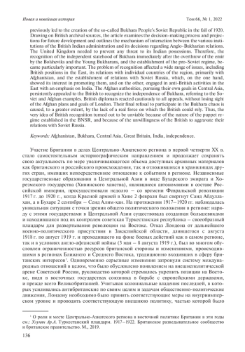Участие Британии в делах Центрально-Азиатского региона в первой четверти XX в. стало самостоятельным историографическим направлением и продолжает сохранять свою актуальность по мере увеличивающегося объема доступных архивных материалов как британского и российского происхождения, так и отложившихся в хранилищах других стран, имевших непосредственное отношение к событиям в регионе. Независимые государственные образования в Центральной Азии в виде Бухарского эмирата и Хорезмского государства (Хивинского ханства), являвшиеся автономиями в составе Российской империи, просуществовали недолго – со времени Февральской революции 1917 г. до 1920 г., когда Красной армией в Хиве 2 февраля был свергнут Саид Абдуллахан, а в Бухаре 2 сентября – Сеид Алим-хан. На протяжении 1917–1920 гг. наблюдалась уникальная ситуация с точки зрения общего политического положения в регионе: наряду с этими государствами в Центральной Азии существовала созданная большевиками и находившаяся под их контролем советская Туркестанская республика – своеобразный плацдарм для развертывания революции на Востоке.