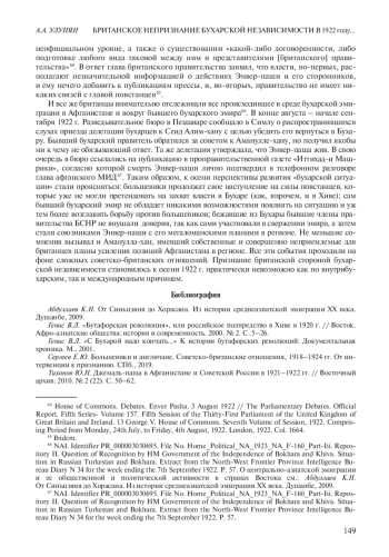Статья посвящена изучению и оценке британцами ситуации в Бухаре, сложившейся зимой 1921–1922 гг., сразу после раскола союза большевиков и младобухарцев, который осенью 1920 г. привел к созданию т. н. Бухарской Народной Советской Республики (БСНР). На основе британских архивных источников в статье исследуются процесс принятия решений, прогнозы будущего развития и освещается механизм взаимодействия между различными учреждениями администрации Британской Индии и ее решения по англобухарским отношениям. Соединенному Королевству было необходимо предотвратить любую угрозу своим индийским владениям. Поэтому признание независимой государственности Бухары сразу после свержения эмира большевиками и младобухарцами и установления просоветского режима приобрело особую важность. Проблема признания затрагивала широкий круг вопросов, в том числе британских позиций на Востоке, связей Британии с отдельными странами региона, в первую очередь с Афганистаном, и установление отношений с Советской Россией, которая, с одной стороны, проявляла свою заинтересованность в налаживании отношений с Британией, а с другой – занималась антибританской деятельностью на Востоке, главным образом в Индии. Афганские власти, преследовавшие собственные цели в Центральной Азии, настойчиво обращались к англичанам с призывом признать независимость Бухары, ссылаясь на советский и афганский примеры. Британские дипломаты осторожно реагировали на все обращения, не теряя из виду афганские планы и цели Лондона. Их окончательный отказ от участия в бухарском хаосе вызван в большей степени отсутствием реальной силы, на которую англичане могли бы опереться. Таким образом, сама идея британского признания оказалась нежизнеспособна из-за характера марионеточного режима, установленного в БНСР, и из-за нежелания британцев обострять отношения с Советской Россией