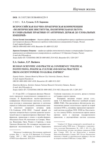 13–14 мая 2021 г. в Самарском филиале Московского городского педагогического университета состоялась II Всероссийская научно-практическая конференция «Политические институты, политическая культура и социальные практики от античных держав до глобальных империй», посвященная памяти известного самарского историка проф. С. Б. Семёнова (1954–2018) 1. Главной сферой его научных интересов было изучение развития политической мысли и парламентаризма в Британии2. Конференция, прошедшая в очном и онлайн-формате, объединила более 40 участников из Самары, Москвы, Владимира, Орла, Рязани и Саратова, а также Уральска (Казахстан)
