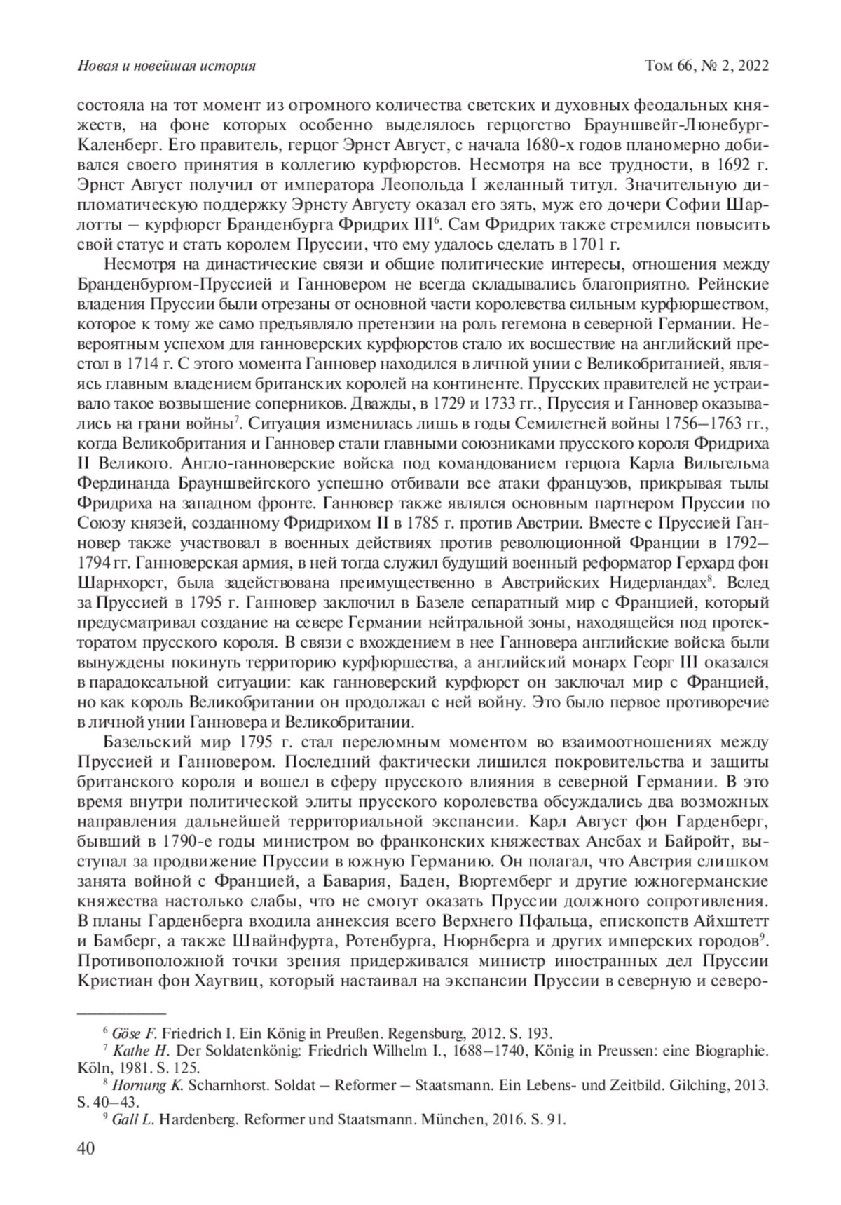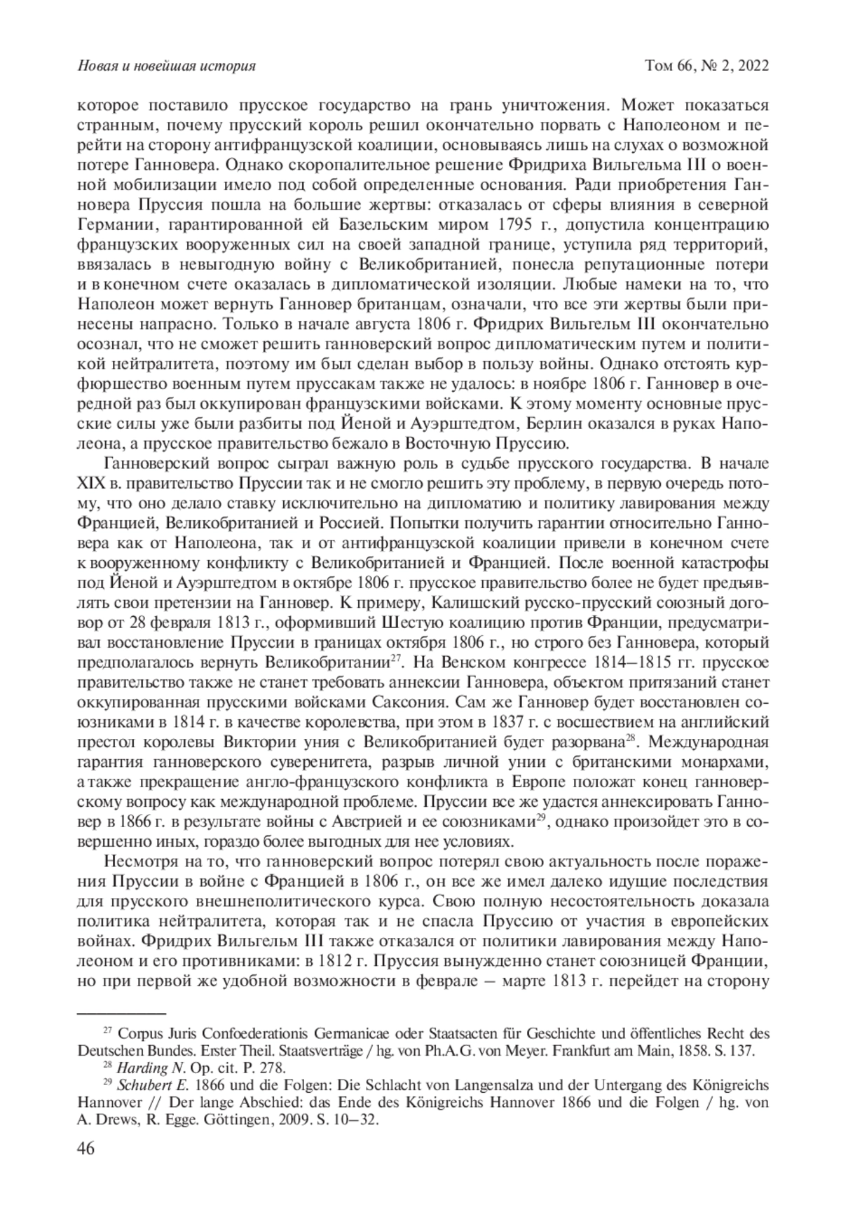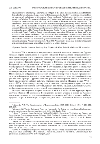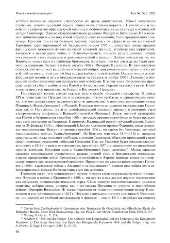 В начале XIX в. основным направлением внешней политики королевства Пруссия являлась борьба за гегемонию в северной Германии. В рамках этого направления прусская политическая элита пыталась решить так называемый ганноверский вопрос – сложную международную проблему, связанную с претензиями сразу трех великих держав, а именно Великобритании, Франции и Пруссии, на курфюршество Ганновер. В научной литературе ганноверский вопрос, как правило, рассматривается в контексте международных отношений начала XIX в. Это касается, к примеру, работ Пола Шрёдера 1 и Амира Бернштайна 2. Большое внимание в историографии уделяется англоганноверской унии и ганноверской проблеме как части британской внешней политики 3. Применительно к Пруссии ганноверский вопрос анализируется в рамках прусской политики нейтралитета, именно в таком ключе затрагивает эту тему австралийский историк Филипп Дуайер 4. Прусские попытки решить ганноверский вопрос в свою пользу бегло упоминаются в общих работах, посвященных истории Пруссии конца XVIII – начала XIX в. 5 Комплексную оценку роли и значения ганноверского вопроса для внешней и внутренней политики Пруссии, однако, эти работы не дают. Крупных исследований по данному вопросу в отечественной историографии не проводилось