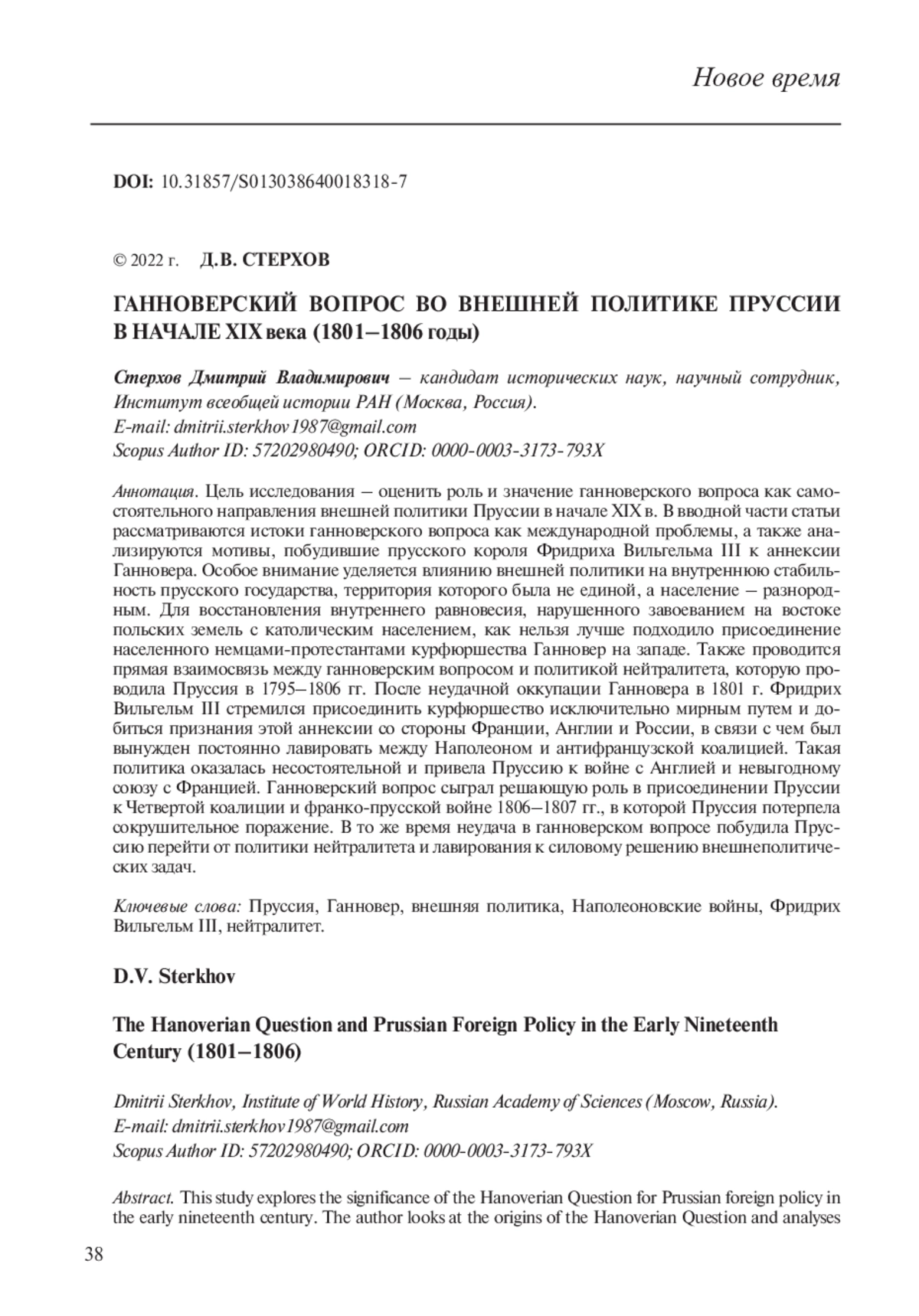 Цель исследования – оценить роль и значение ганноверского вопроса как самостоятельного направления внешней политики Пруссии в начале XIX в. В вводной части статьи рассматриваются истоки ганноверского вопроса как международной проблемы, а также анализируются мотивы, побудившие прусского короля Фридриха Вильгельма III к аннексии Ганновера. Особое внимание уделяется влиянию внешней политики на внутреннюю стабильность прусского государства, территория которого была не единой, а население – разнородным. Для восстановления внутреннего равновесия, нарушенного завоеванием на востоке польских земель с католическим населением, как нельзя лучше подходило присоединение населенного немцами-протестантами курфюршества Ганновер на западе. Также проводится прямая взаимосвязь между ганноверским вопросом и политикой нейтралитета, которую проводила Пруссия в 1795–1806 гг. После неудачной оккупации Ганновера в 1801 г. Фридрих Вильгельм III стремился присоединить курфюршество исключительно мирным путем и добиться признания этой аннексии со стороны Франции, Англии и России, в связи с чем был вынужден постоянно лавировать между Наполеоном и антифранцузской коалицией. Такая политика оказалась несостоятельной и привела Пруссию к войне с Англией и невыгодному союзу с Францией. Ганноверский вопрос сыграл решающую роль в присоединении Пруссии к Четвертой коалиции и франко-прусской войне 1806–1807 гг., в которой Пруссия потерпела сокрушительное поражение. В то же время неудача в ганноверском вопросе побудила Пруссию перейти от политики нейтралитета и лавирования к силовому решению внешнеполитических задач