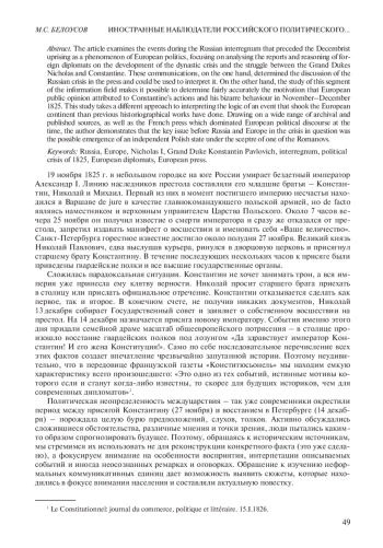 В предлагаемой статье рассматриваются события российского междуцарствия, предшествовавшего восстанию декабристов, как явления европейской политики, так как основное внимание сосредоточено на анализе донесений и рассуждений иностранных дипломатов из частной переписки и мемуаров о развитии династического кризиса и борьбе между великими князьями Николаем и Константином Павловичами. Сообщения дипломатов нередко становились известны не только политикам, но и журналистам. Опираясь на полученные факты, публицисты предлагали собственную достаточно часто более смелую интерпретацию причин и логики развития российского политического кризиса. Кроме того, исследование этого сегмента информационного поля дает возможность достаточно четко выстроить, какую мотивировку европейское общественное мнение приписывало поступкам Константина Павловича и его «странному» поведению в ноябре–декабре 1825 г. Реализация обозначенных векторов дает возможность иначе интерпретировать логику события, потрясшего весь Европейский континент, чем это было сделано в предшествующей историографии. Опираясь на широкий круг архивных и опубликованных источников, а также материалов французской прессы, определявшей в данную эпоху европейский политический дискурс, в статье показано, что ключевой проблемой, стоявшей перед Россией и Европой, в рассматриваемом кризисе был вопрос о возможном возникновении независимого польского государства под скипетром одного из Романовых.