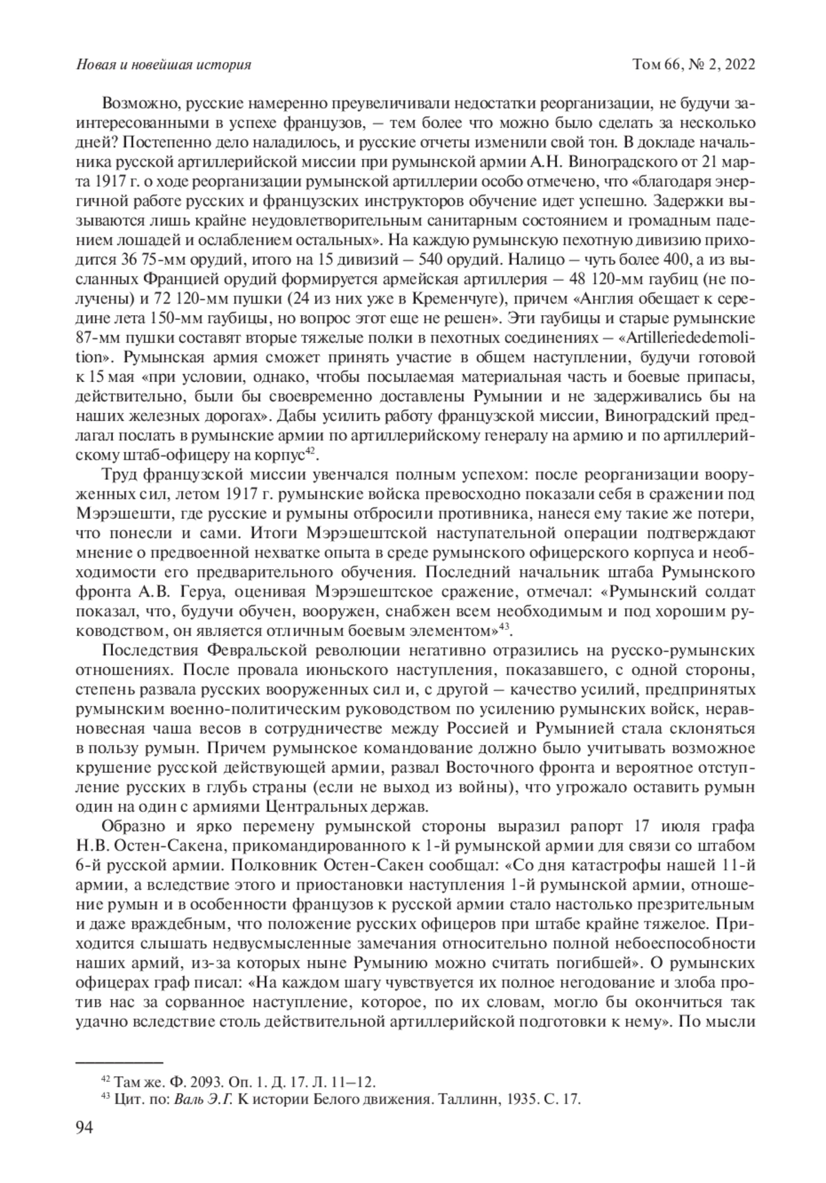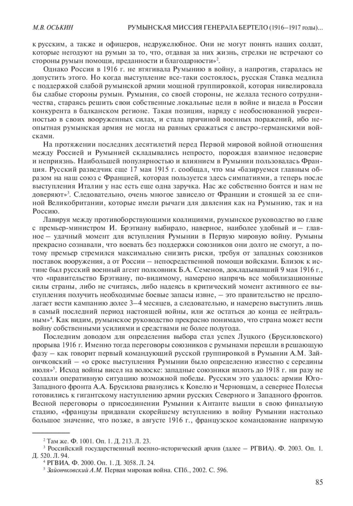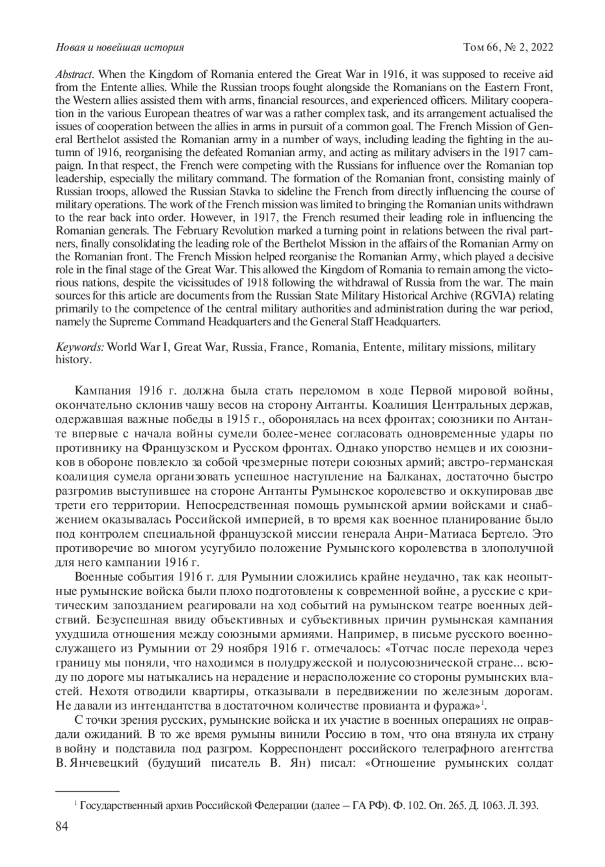 Вступление Румынского королевства в Первую мировую войну в 1916 г. предполагало оказание ей помощи со стороны союзников по Антанте. Русские войска воевали совместно с румынами на Восточном фронте, западные союзники помогали оружием, финансами и опытными офицерами. Военное сотрудничество на различных европейских театрах войны являлось достаточно сложной задачей, а его организация актуализирует проблемы взаимодействия союзников по оружию для достижения общей цели. Французская миссия генерала Бертело оказала румынской армии самую разнообразную поддержку – руководство боевыми действиями осенью 1916 г., реорганизация разгромленной румынской армии, выполнение роли военных советников в кампании 1917 г. В этом отношении французы соперничали с русскими за влияние на высшее румынское руководство – прежде всего военное командование. Создание Румынского фронта, состоявшего в основном из русских войск, позволило русской Ставке отстранить французов от непосредственного влияния на ход военных действий. Деятельность французской миссии ограничивалась приведением в порядок отведенных в тыл румынских подразделений. Однако в 1917 г. французы вновь заняли лидирующее положение в воздействии на румынский генералитет. Переломным моментом в этом сотрудничестве-соперничестве стала Февральская революция, окончательно закрепившая ведущую роль миссии Бертело в делах румынской армии на Румынском фронте. Деятельность французской миссии помогла реорганизовать румынскую армию, сыгравшую решающую роль на заключительном этапе Первой мировой войны, позволив Румынскому королевству остаться в числе победителей, невзирая на перипетии 1918 г., связанные с выходом России из войны. Основными источниками статьи послужили документы Российского государственного военно-исторического архива (РГВИА), относящиеся прежде всего к компетенции центральных органов военной власти и управления в военный период – Ставки Верховного командования и Главного управления Генерального штаба