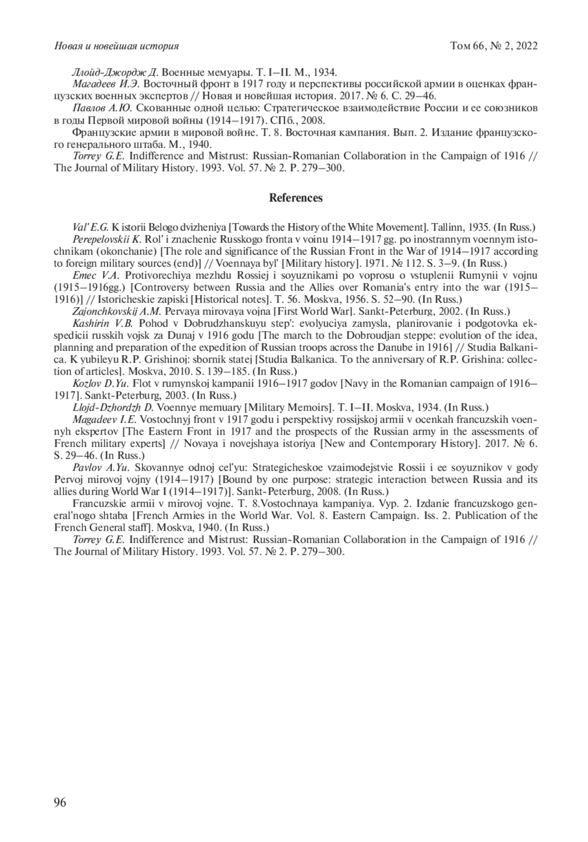 11. Torrey G.E. Indifference and Mistrust: Russian-Romanian Collaboration in the Campaign of 1916 // The Journal of Military History. 1993. Vol. 57. № 2. P. 279-300.