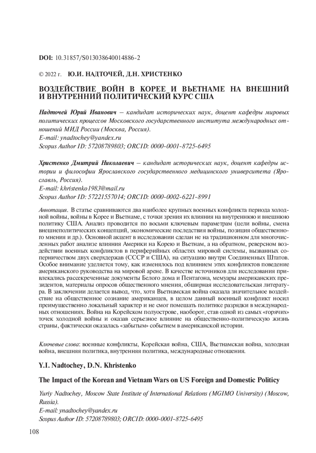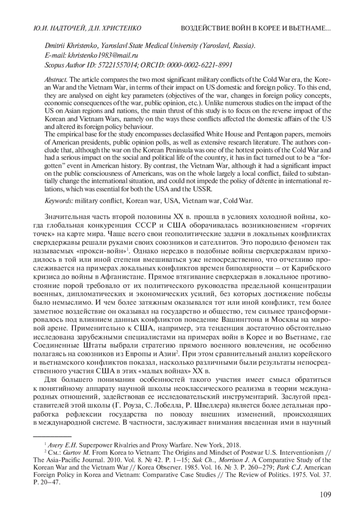 В статье сравниваются два наиболее крупных военных конфликта периода холодной войны, войны в Корее и Вьетнаме, с точки зрения их влияния на внутреннюю и внешнюю политику США. Анализ проводится по восьми ключевым параметрам (цели войны, смена внешнеполитических концепций, экономические последствия войны, позиция общественного мнения и др.). Основной акцент в исследовании сделан не на традиционном для многочисленных работ анализе влияния Америки на Корею и Вьетнам, а на обратном, реверсном воздействии военных конфликтов в периферийных областях мировой системы, вызванных соперничеством двух сверхдержав (СССР и США), на ситуацию внутри Соединенных Штатов. Особое внимание уделяется тому, как изменялось под влиянием этих конфликтов поведение американского руководства на мировой арене. В качестве источников для исследования привлекались рассекреченные документы Белого дома и Пентагона, мемуары американских президентов, материалы опросов общественного мнения, обширная исследовательская литература. В заключении делается вывод, что, хотя Вьетнамская война оказала значительное воздействие на общественное сознание американцев, в целом данный военный конфликт носил преимущественно локальный характер и не смог помешать политике разрядки в международных отношениях. Война на Корейском полуострове, наоборот, став одной из самых «горячих» точек холодной войны и оказав серьезное влияние на общественно-политическую жизнь страны, фактически оказалась «забытым» событием в американской истории