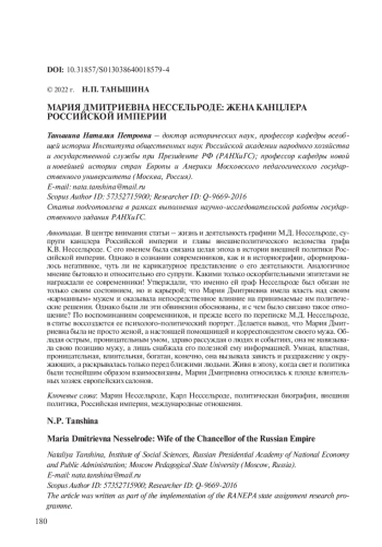 В центре внимания статьи – жизнь и деятельность графини М. Д. Нессельроде, супруги канцлера Российской империи и главы внешнеполитического ведомства графа К. В. Нессельроде. С его именем была связана целая эпоха в истории внешней политики Российской империи. Однако в сознании современников, как и в историографии, сформировалось негативное, чуть ли не карикатурное представление о его деятельности. Аналогичное мнение бытовало и относительно его супруги. Какими только оскорбительными эпитетами не награждали ее современники! Утверждали, что именно ей граф Нессельроде был обязан не только своим состоянием, но и карьерой; что Мария Дмитриевна имела власть над своим «карманным» мужем и оказывала непосредственное влияние на принимаемые им политические решения. Однако были ли эти обвинения обоснованы, и с чем было связано такое отношение? По воспоминаниям современников, и прежде всего по переписке М. Д. Нессельроде, в статье воссоздается ее психолого-политический портрет. Делается вывод, что Мария Дмитриевна была не просто женой, а настоящей помощницей и корреспондентом своего мужа. Обладая острым, проницательным умом, здраво рассуждая о людях и событиях, она не навязывала свою позицию мужу, а лишь снабжала его полезной ему информацией. Умная, властная, проницательная, влиятельная, богатая, конечно, она вызывала зависть и раздражение у окружающих, а раскрывалась только перед близкими людьми. Живя в эпоху, когда свет и политика были теснейшим образом взаимосвязаны, Мария Дмитриевна относилась к плеяде влиятельных хозяек европейских салонов