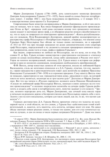С именем графа Карла Васильевича Нессельроде связана целая эпоха в истории внешней политики Российской империи. Однако в сознании современников, как и в историографии, сформировалось негативное, чуть ли не карикатурное представление о его деятельности. То же можно сказать и о его супруге, Марии Дмитриевне Нессельроде 1. Злые языки утверждали, что именно ей граф Нессельроде был обязан не только своим состоянием, но и карьерой; якобы она имела власть над своим «карманным» мужем и оказывала непосредственное влияние на принимаемые им политические решения. Однако были ли эти обвинения обоснованы, и с чем было связано такое отношение?