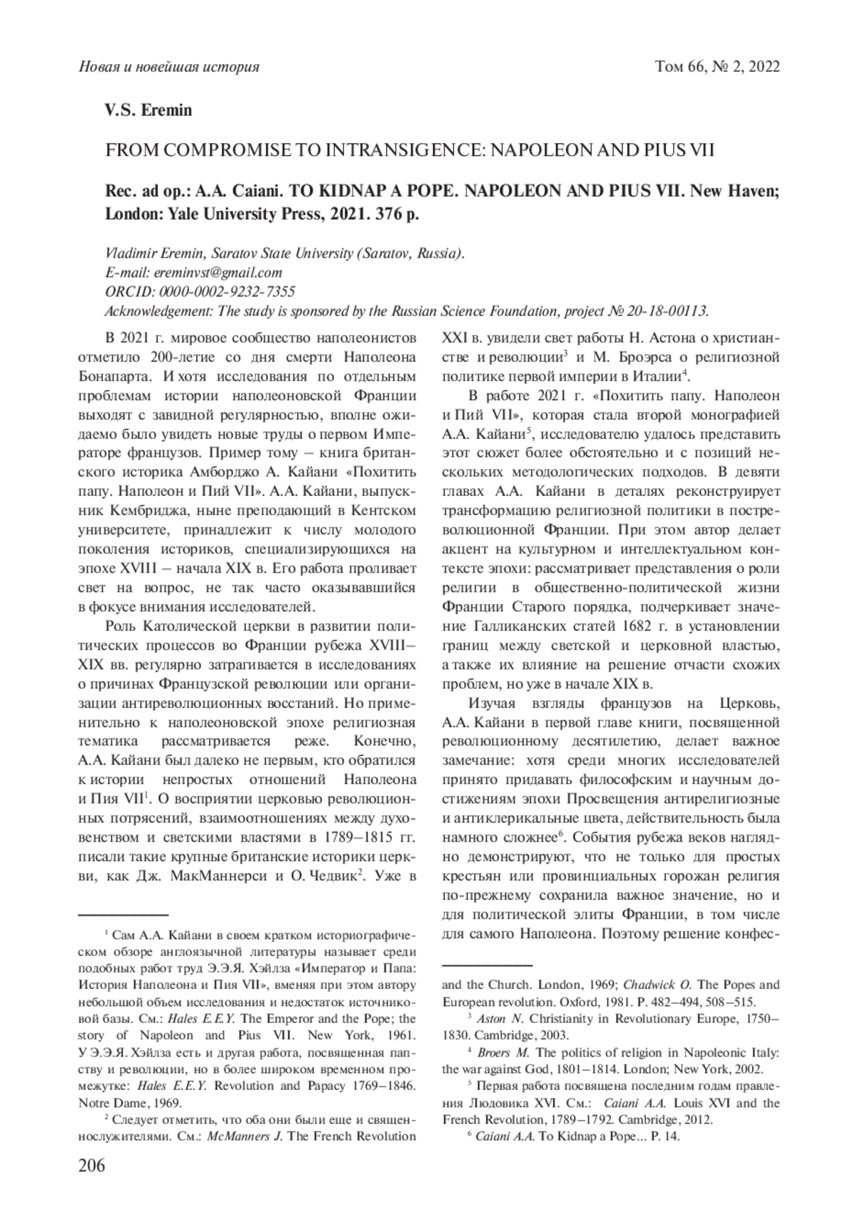 В 2021 г. мировое сообщество наполеонистов отметило 200-летие со дня смерти Наполеона Бонапарта. И хотя исследования по отдельным проблемам истории наполеоновской Франции выходят с завидной регулярностью, вполне ожидаемо было увидеть новые труды о первом Императоре французов. Пример тому – книга британского историка Амборджо А. Кайани «Похитить папу. Наполеон и Пий VII». А. А. Кайани, выпускник Кембриджа, ныне преподающий в Кентском университете, принадлежит к числу молодого поколения историков, специализирующихся на эпохе XVIII – начала XIX в. Его работа проливает свет на вопрос, не так часто оказывавшийся в фокусе внимания исследователей