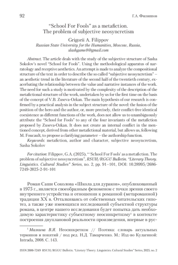 Статья посвящена изучению субъектной структуры романа Саши Соколова «Школа для дураков». Используя методологический аппарат нарратологии и рецептивной эстетики, предпринимается попытка анализа композиционного устройства рассматриваемого текста с целью описания так называемого субъектного неосинкретизма – эстетической тенденции в литературе второй половины ХХ в., обостряющей отношения между ценностными и повествовательными инстанциями произведения. Необходимость подобного исследования мотивирована сложностью описания метароманной структуры произведения, предпринимаемой нами впервые на основании концепции В. Б. Зусевой-Озкан. Основная гипотеза нашего исследования подтверждается практическим анализом субъектной структуры произведения: возникающее неразличение позиции героя и автора или, точнее, их бесконфликтное тождественное сосуществование в качестве разных функций произведения, не позволяет нам однозначно отнести «Школу для дураков» ни к одному из четырех инвариантов метаромана, предложенных Вероникой Борисовной. Это не создает внутреннего конфликта упомянутой концепции, выведенной на другом метароманном материале, однако позволяет нам, вслед за М. Фуко, предложить уточняющий ее параметр – функция авторства.