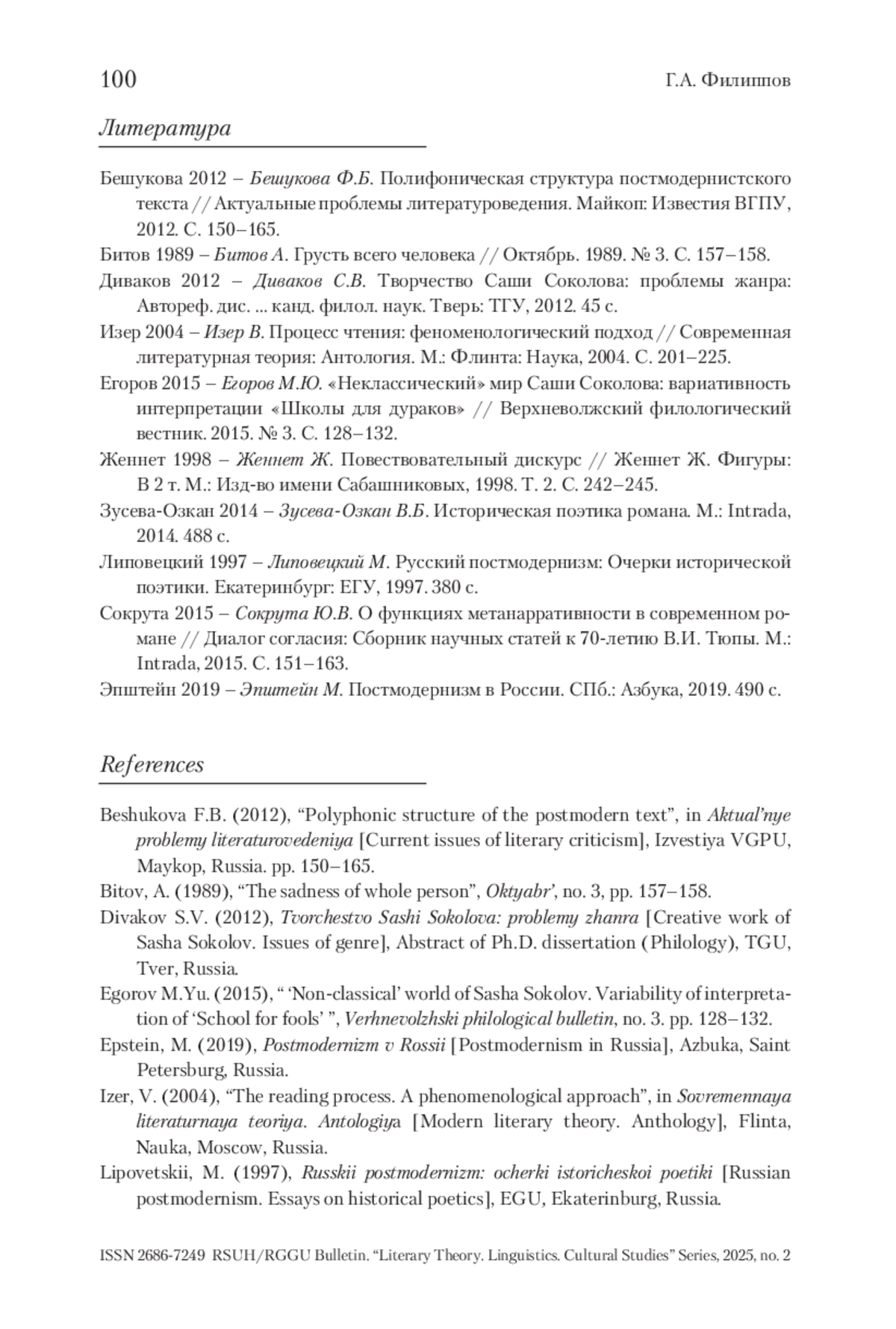 1. Бешукова 2012 - Бешукова Ф.Б. Полифоническая структура постмодернистского текста // Актуальные проблемы литературоведения. Майкоп: Известия ВГПУ, 2012. С. 150-165.