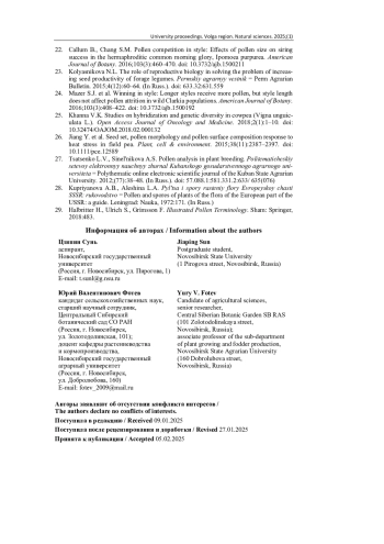 22. Callum B., Chang S. M. Pollen competition in style: Effects of pollen size on siring success in the hermaphroditic common morning glory, Ipomoea purpurea // American Journal of Botany. 2016. Vol. 103, № 3. P. 460-470. DOI: 10.3732/ajb.1500211