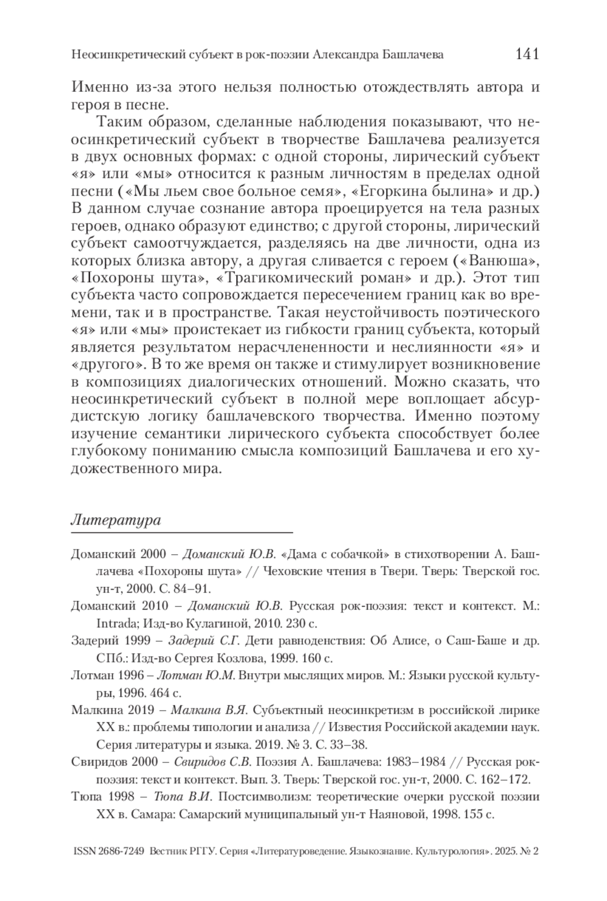 5. Малкина 2019 - Малкина В.Я. Субъектный неосинкретизм в российской лирике ХХ в.: проблемы типологии и анализа // Известия Российской академии наук. Серия литературы и языка. 2019. № 3. С. 33-38.