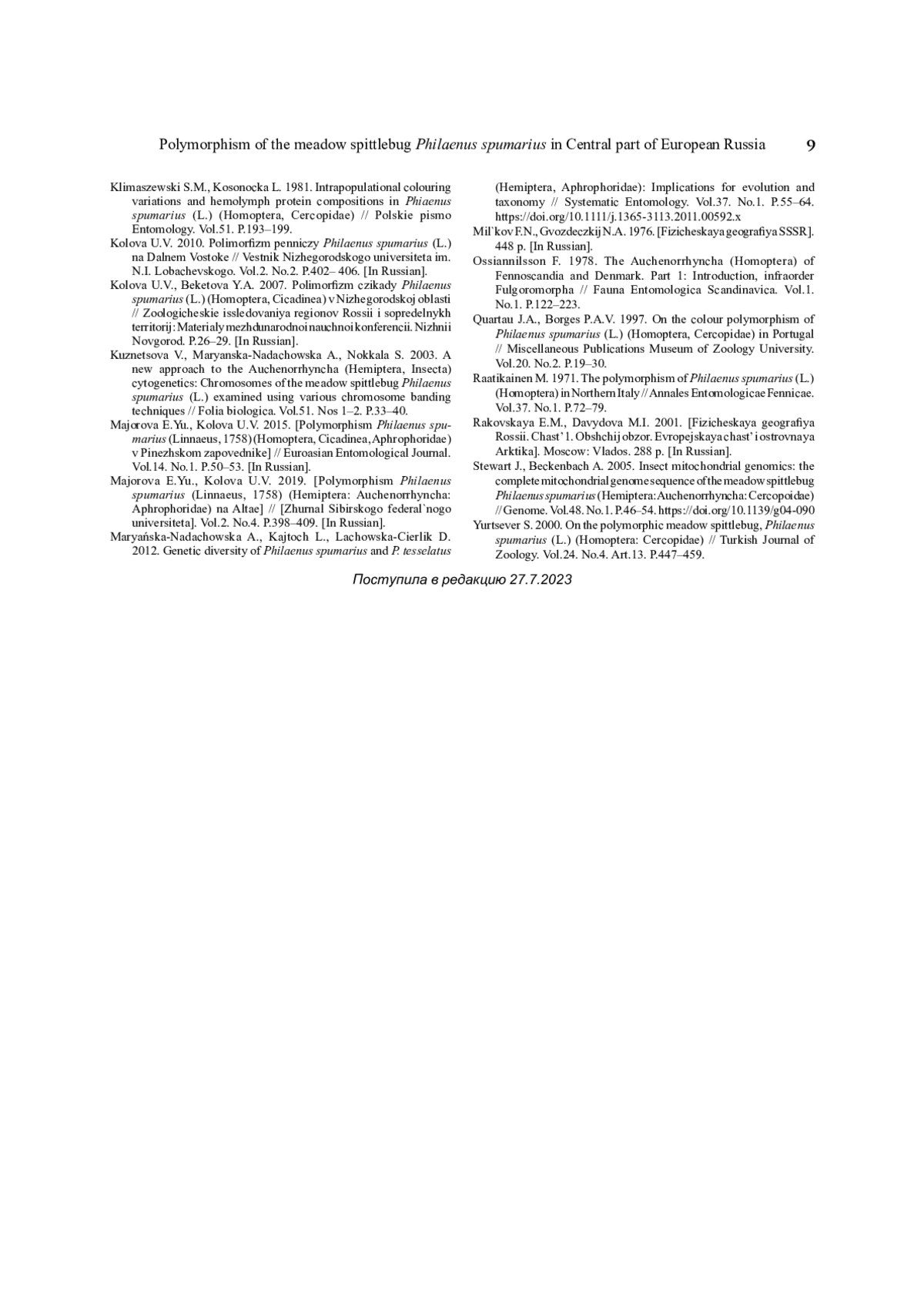 12. Kolova U.V., Beketova Y.A. 2007. Polimorfizm czikady Philaenus spumarius (L.) (Homoptera, Cicadinea) v Nizhegorodskoj oblasti // Zoologicheskie issledovaniya regionov Rossii i sopredelnykh territorij: Materialy mezhdunarodnoi nauchnoi konferencii. Nizhnii Novgorod. P.26-29. [In Russian].