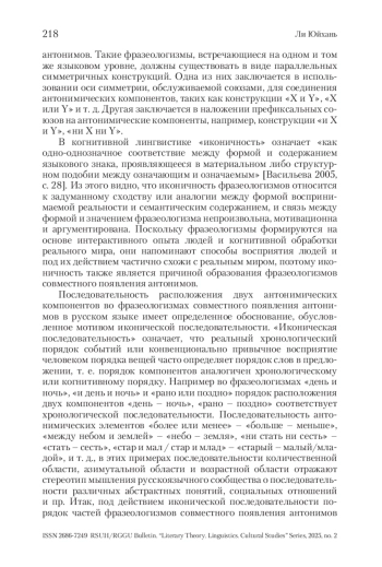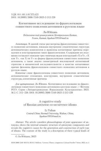 В данной статье рассмотрены фразеологизмы совместного появления антонимов, показана внутренняя семантическая структура антонимических компонентов и выявлены когнитивные причины порождения и конструирования таких фразеологизмов. Содержание исследования составляет описание трех типичных видов конструкций «X и Y», «X или Y», «ни X ни Y» из формы фразеологизмов совместного появления антонимов, а также анализ симметричной воплощенной когнитивной стратегии и иконической последовательности в качестве когнитивных причин феномена фразеологизмов совместного появления антонимов в русском языке.