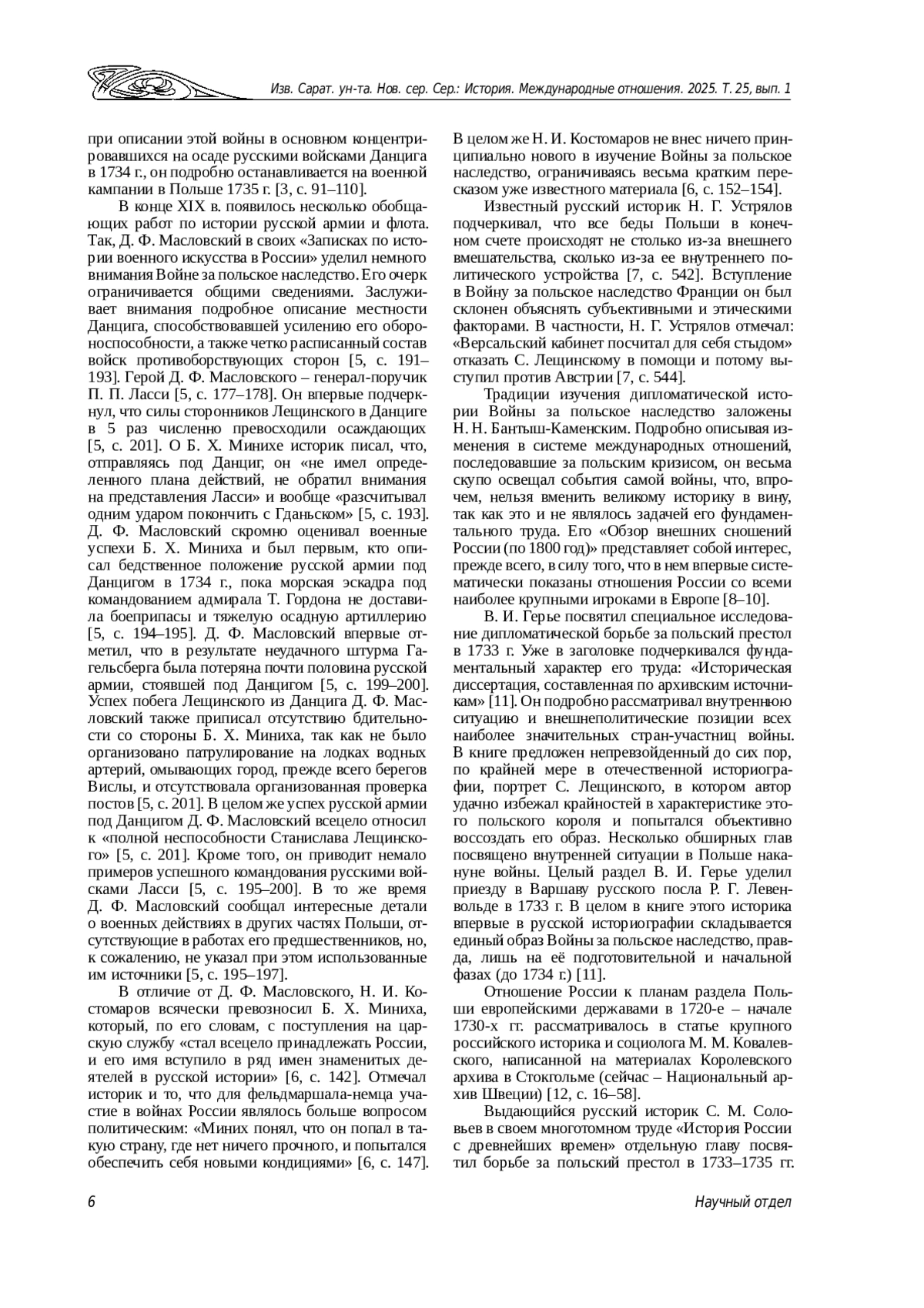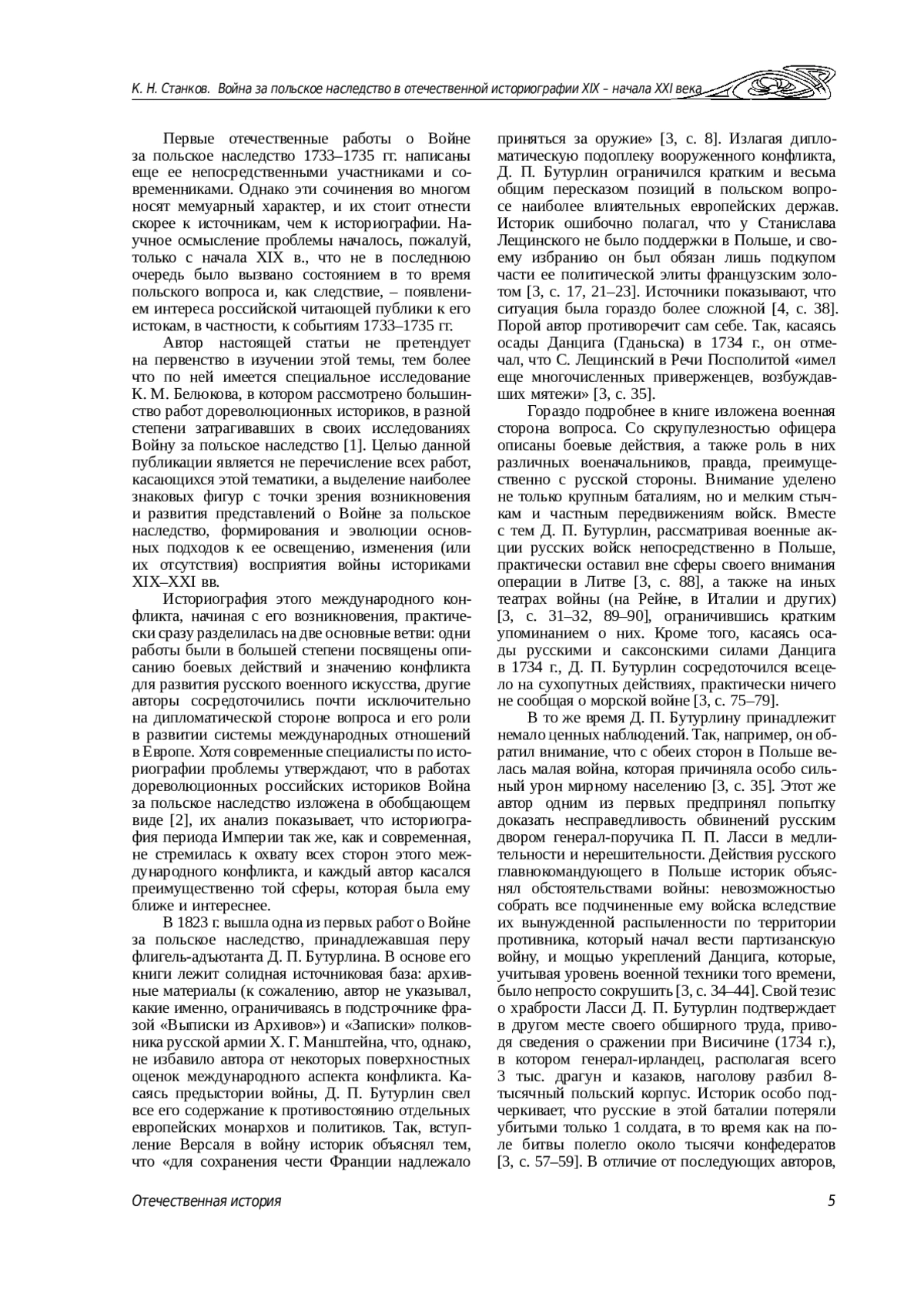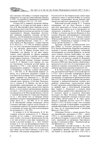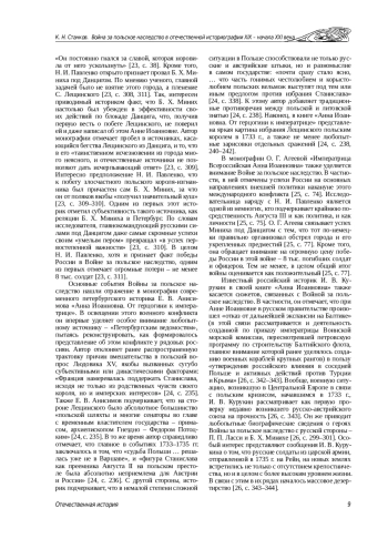 Первые отечественные работы о Войне за польское наследство 1733–1735 гг. написаны еще ее непосредственными участниками и современниками. Однако эти сочинения во многом носят мемуарный характер, и их стоит отнести скорее к источникам, чем к историографии. Научное осмысление проблемы началось, пожалуй, только с начала XIX в., что не в последнюю очередь было вызвано состоянием в то время польского вопроса и, как следствие,– появлением интереса российской читающей публики к его истокам, в частности, к событиям 1733–1735 гг.