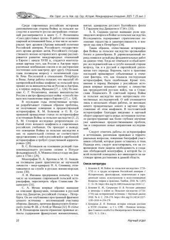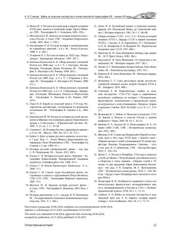 1. Белюков К. М. Война за “польское наследство” 1733- 1735 гг. в трудах историков Российской империи // Исторические, философские, политические и юридические науки, культурология и искусствоведение. Вопросы теории и практики. Тамбов, 2018. № 1 (87). С. 11-18. DOI: 10.30853/manuscript.2018-1.2