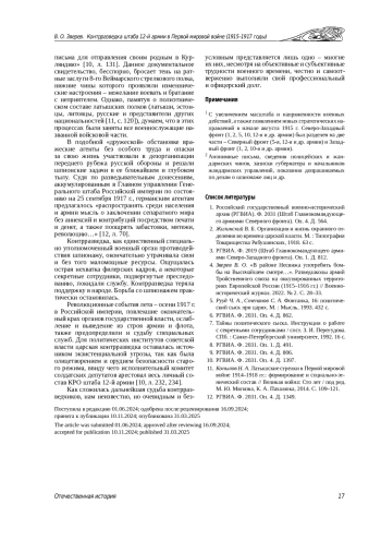 Рассматривается малоизвестная история контрразведывательного отделения штаба 12-й армии сквозь призму деятельности двух инструментов противодействия шпионажу – филерского отряда и секретных сотрудников. С опорой на введенные в научный оборот незнакомые архивные документы (переписка контрразведки с жандармскими управлениями, приказы по 12-й армии, сведения на лиц, заподозренных в военном шпионаже, рапорты о задержании шпионов, списки агентов и др.) делается вывод о неудовлетворительных итогах работы армейской контрразведки. Ее наблюдательные агенты (филеры) показали свою профессиональную непригодность. Главным образом это выражалось в отсутствии достаточных юридических и специальных познаний, практического опыта. В редких случаях задержания государственных преступников (германские, реже австрийские, агенты, они же предатели Родины) с участием филеров завершались дознанием или расследованием с последующей судебной перспективой. Вторая категория – секретные сотрудники – также демонстрировали низкий результат своей деятельности. Да и можно ли было надеяться на успех, если ее организация имела слабые основания. Практически весь руководящий состав контрразведки 12-й армии (за исключением ее начальника) был представлен полицейскими, которые не владели организационно-тактическими приемами и методами выявления шпионов. В силу своих должностных обязанностей полицейские чины занимались лишь постановкой их розыска(розыском уже установленных лиц). И поэтому основная масса шпионов задерживалась случайно и, как правило, на передней линии обороны 12-й армии, благодаря бдительности и наблюдательности ее военнослужащих.