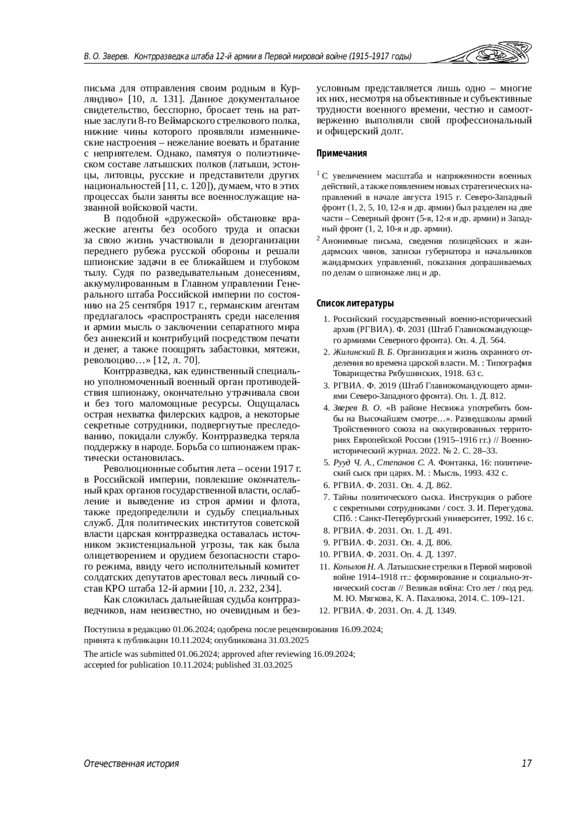 4. Зверев В. О. “В районе Несвижа употребить бомбы на Высочайшем смотре…”. Разведшколы армий Тройственного союза на оккупированных территориях Европейской России (1915-1916 гг.) // Военно-исторический журнал. 2022. № 2. С. 28-33. EDN: RWZBBG