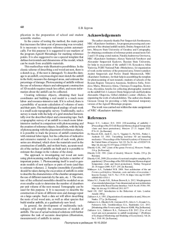 The ant nest is the home and shelter of the ant colony. For small colonies of some species, the nest is the only place where individuals communicate and coordinate their actions. Nest building is one of the most highly organized processes in the life of an ant colony [Zakharov, 1991]. The nest parameters (e. g. number of exits, mound size, etc.) refl ect the state of the ant colony [Zakharov et al., 2015]. The evolution of ant sociality is closely linked to the evolution of nest building [Sudd, 1967; Zakharov, 1991]. Thus, the study of ant nest structure and the specifi cs of the construction process, is important not only for revealing behavioral traits of species, but also for studying the evolution of ants.