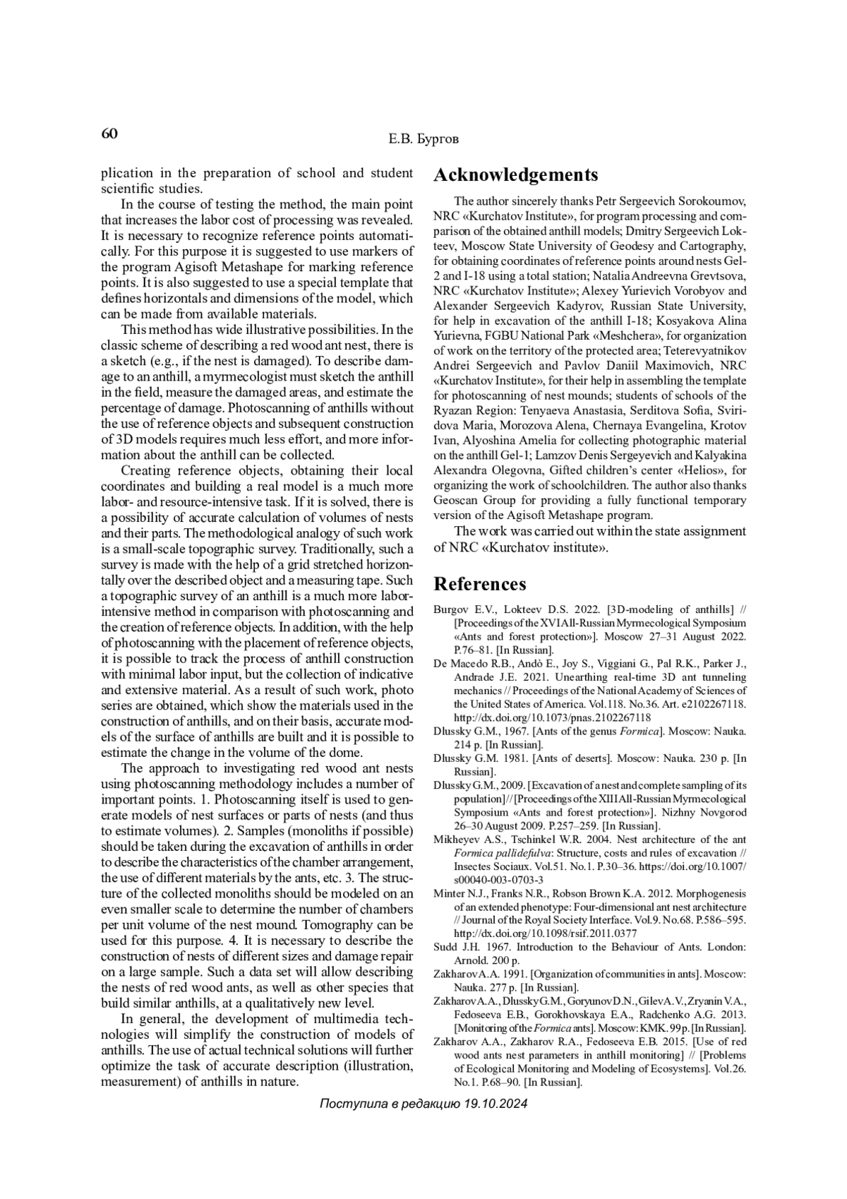 1. Burgov E.V., Lokteev D.S. 2022. [3D-modeling of anthills] // [Proceedings of the XVI All-Russian Myrmecological Symposium “Ants and forest protection”]. Moscow 27-31 August 2022. P.76-81. [In Russian].