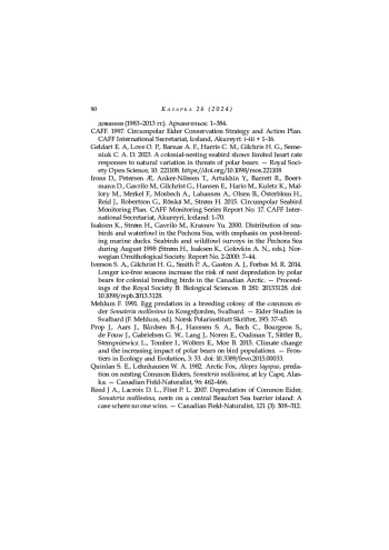 38. Reed J A., Lacroix D. L., Flint P. L. 2007. Depredation of Common Eider, Somateria mollissima, nests on a central Beaufort Sea barrier island: A case where no one wins. - Canadian Field-Naturalist, 121 (3): 308-312.