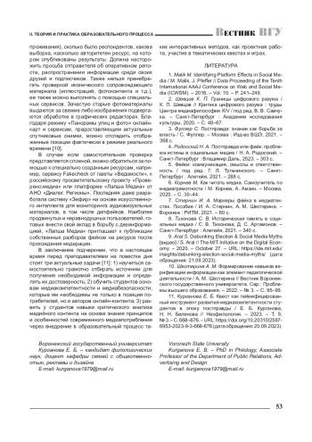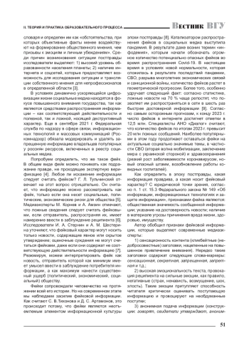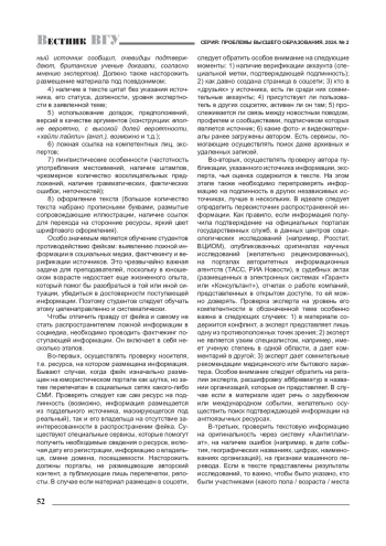 10. Шестерина А. М. Формирование навыков верификации информации как элемент педагогической деятельности / А. М. Шестерина // Вестник Воронежского государственного университета. Сер.: Проблемы высшего образования. - 2022. - № 3. - С. 95-99. EDN: HGUUVT