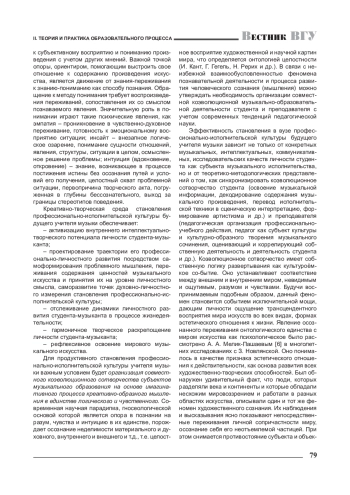 Эффективность становления в вузе профессионально-исполнительской культуры будущего учителя музыки зависит не только от конкретных музыкальных, интеллектуальных, коммуникативных, исследовательских качеств личности студента как субъекта музыкального исполнительства, но и от теоретико-методологических представлений о том, как синхронизировать коэволюционное сотворчество студента (освоение музыкальной информации, декодирование содержания музыкального произведения, перевод исполнительской техники в сценическую интерпретацию, формирование артистизма и др.) и преподавателя (педагогическая организация профессионально-учебного действия, педагог как субъект культуры и культурно-образного творения музыкального сочинения, оценивающий и коррелирующий собственную деятельность и деятельность студента и др.).