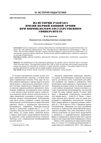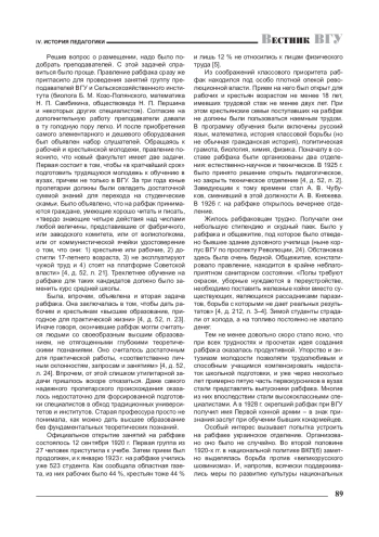 Уже через год убедившиеся в несостоятельности расчетов на то, что пролетарского происхождения достаточно для овладения основами наук, организаторы советской высшей школы вынуждены были приступить к регулированию студенческого потока. Пришлось признать, что предварительное обучение и приобретение основ общенаучных знаний необходимо и для юных пролетариев. Поэтому летом 1919 г. в Народном комиссариате просвещения РСФСР (Наркомпросе) созрело решение организовать при ведущих университетах рабочие факультеты со статусом подготовительных подразделений. Принимать в них следовало только надежных и, как говорили в ту пору, «социально ценных» с точки зрения классового происхождения молодых людей [1, с. 14]. Перед новыми учебными учреждениями ставилась, таким образом, двоякая задача: поднять уровень знаний пролетарско-бедняцкой молодежи до возможности освоения университетских программ и изменить социальный состав студенчества в пользу победившего в результате революции класса.