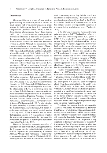 Microsporidia are a group of very ancient spore-forming intracellular parasites related to fungi. Almost half of microsporidia genera infect insects, including pests, beneficial parasitoids and predators (Bjørnson and Oi, 2014), as well as domesticated silkworms and honey bees (James and Li, 2012). In the latter case, widespread and destructive infections in bee farms are caused by the microsporidia Vairimorpha (Nosema) ceranae, first discovered in the Asian honey bee Apis cerana (Fries et al., 1996). Although the association of this emergent pathogen with colony losses of honey bees Apis mellifera is still controversial (Higes et al., 2008; Higes et al., 2009; Gisder and Genersch, 2015; Martín-Hernández et al., 2018; Schüler et al., 2023), prevention and treatment of V. ceranae infection in bee hives remains an important task.