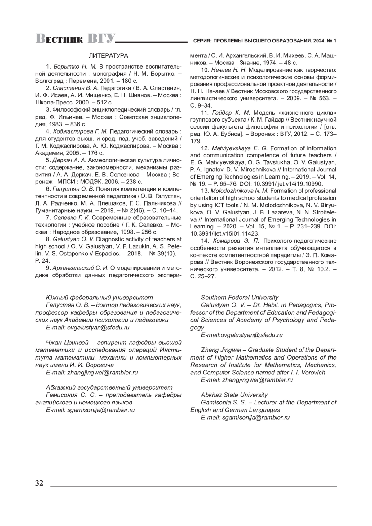 6. Галустян О. В. Понятия компетенции и компетентности в современной педагогике / О. В. Галустян, Л. А. Радченко, М. А. Плешаков, Г. С. Пальчикова // Гуманитарные науки. - 2019. - № 2(46). - С. 10-14.