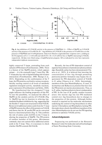 25. Selim K.A., Lapina T., Forchhammer K. and Ermilova E. 2020b.Interaction of N-acetyl-l-glutamate kinase with the PII signal transducer in the non-photosynthetic alga Polytomella parva: co-evolution towards a hetero-oligomeric enzyme. FEBS J. 287 (3): 465-482. DOI: 10.1111/febs.14989