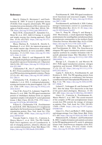 31. Zeth K., Fokina O. and Forchhammer K. 2014. Structural basis and Target-Specific modulation of ADP Sensing by the Synechococcus elongatus PII signaling protein. J. Biol. Chem. 289: 8960-72.