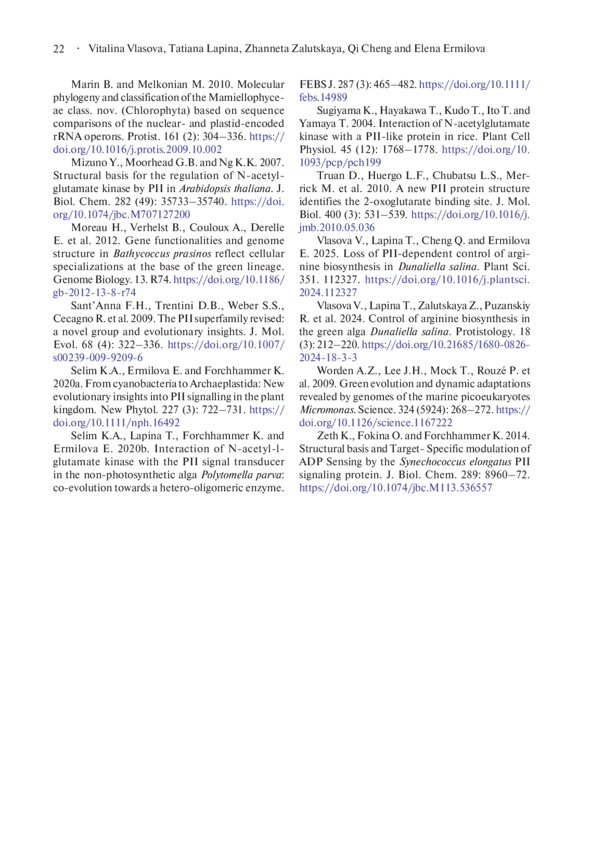 28. Vlasova V., Lapina T., Cheng Q. and Ermilova E. 2025. Loss of PII-dependent control of arginine biosynthesis in Dunaliella salina. Plant Sci. 351. 112327. DOI: 10.1016/j.plantsci.2024.112327