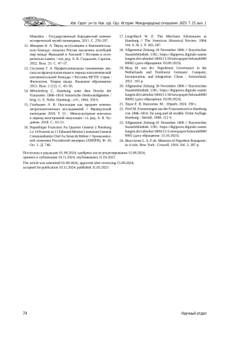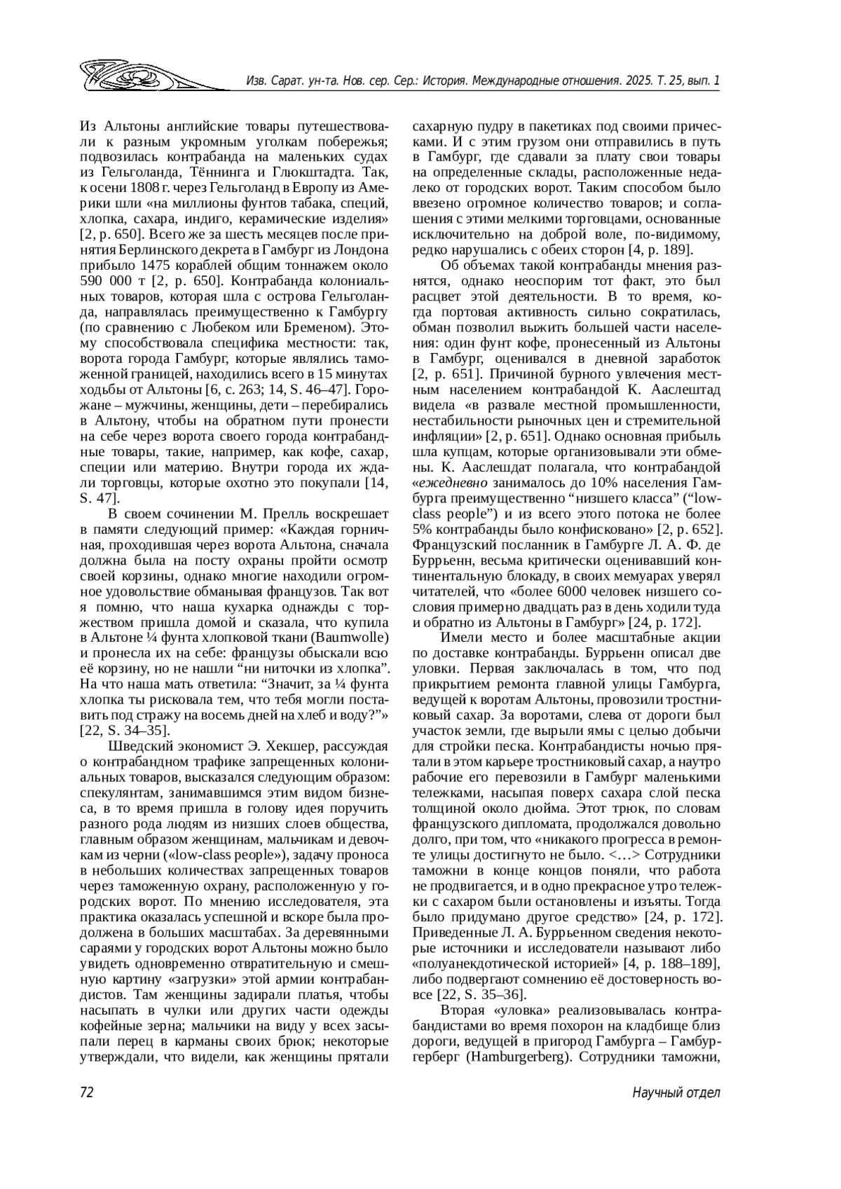 ГУНЬКО А. А. ФРАНЦУЗСКАЯ ОККУПАЦИЯ ГАМБУРГА В 1806 Г.: КОНТИНЕНТАЛЬНАЯ БЛОКАДА И КОНТРАБАНДА // ИЗВЕСТИЯ САРАТОВСКОГО УНИВЕРСИТЕТА. НОВАЯ СЕРИЯ. СЕРИЯ: ИСТОРИЯ. МЕЖДУНАРОДНЫЕ ОТНОШЕНИЯ. 2025. Т. 25 № 1