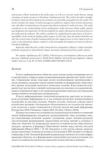 Статья посвящена актуальной проблеме этики манипулятивного воздействия в медиасфере. Исследование охватывает вызовы, стоящие перед современными медиа, демонстрируя перспективы этического регулирования с целью поддержания информационной безопасности общества. Необходимость развития и продвижения этических стандартов в медиапространстве так же, как и повышение медиаграмотности среди потребителей медиаресурсов, становится принципиальной задачей. Автором описываются примеры нарушения этики в случае, когда потребители информации неизбежно оказываются объектом манипуляции со стороны средств массовой информации. В статье рассматривается влияние медийных сообщений на аудиторию, анализируется их содержание и восприятие, а также предлагаются рекомендации по совершенствованию этических стандартов в медиадискурсе. Исследование вносит вклад в понимание того, как манипулятивный медиадискурс формирует общественное мнение и подчеркивает важность соблюдения этических норм в контексте информационного взаимодействия СМИ с аудиторией. В заключении автор подчеркивает важность социальной ответственности медиа в формировании общественного мнения. При этом выявляются не только текущие проблемы медиакоммуникации, но и предлагаются способы их решения для создания безопасного информационного климата, способствующего устойчивому развитию общества в условиях современных вызовов.