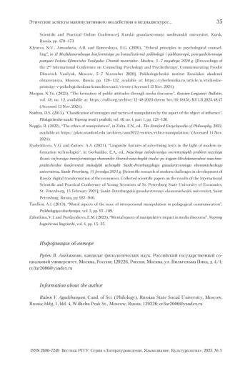 2. Заботкина, Позднякова 2023 - Заботкина В.И., Позднякова Е.М. Ментальные пространства манипулятивного воздействия в медиадискурсе // Вопросы когнитивной лингвистики. 2023. № 4. С. 15-25.