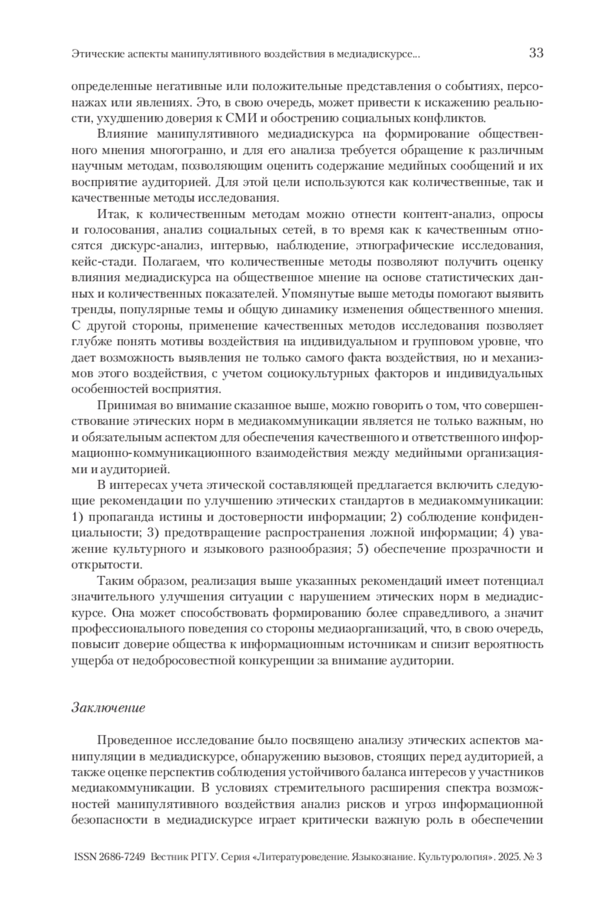 Кроме того, проблема манипулятивного влияния в медиадискурсе особенно четко актуализируется в контексте политической коммуникации и рекламы, где зачастую преследуются цели, скрытые от публики [Гнездилова 2019]. Это ставит перед журналистами, редакторами и медиаменеджерами задачу балансирования между достижением коммерческих и политических целей и соблюдением этических стандартов.