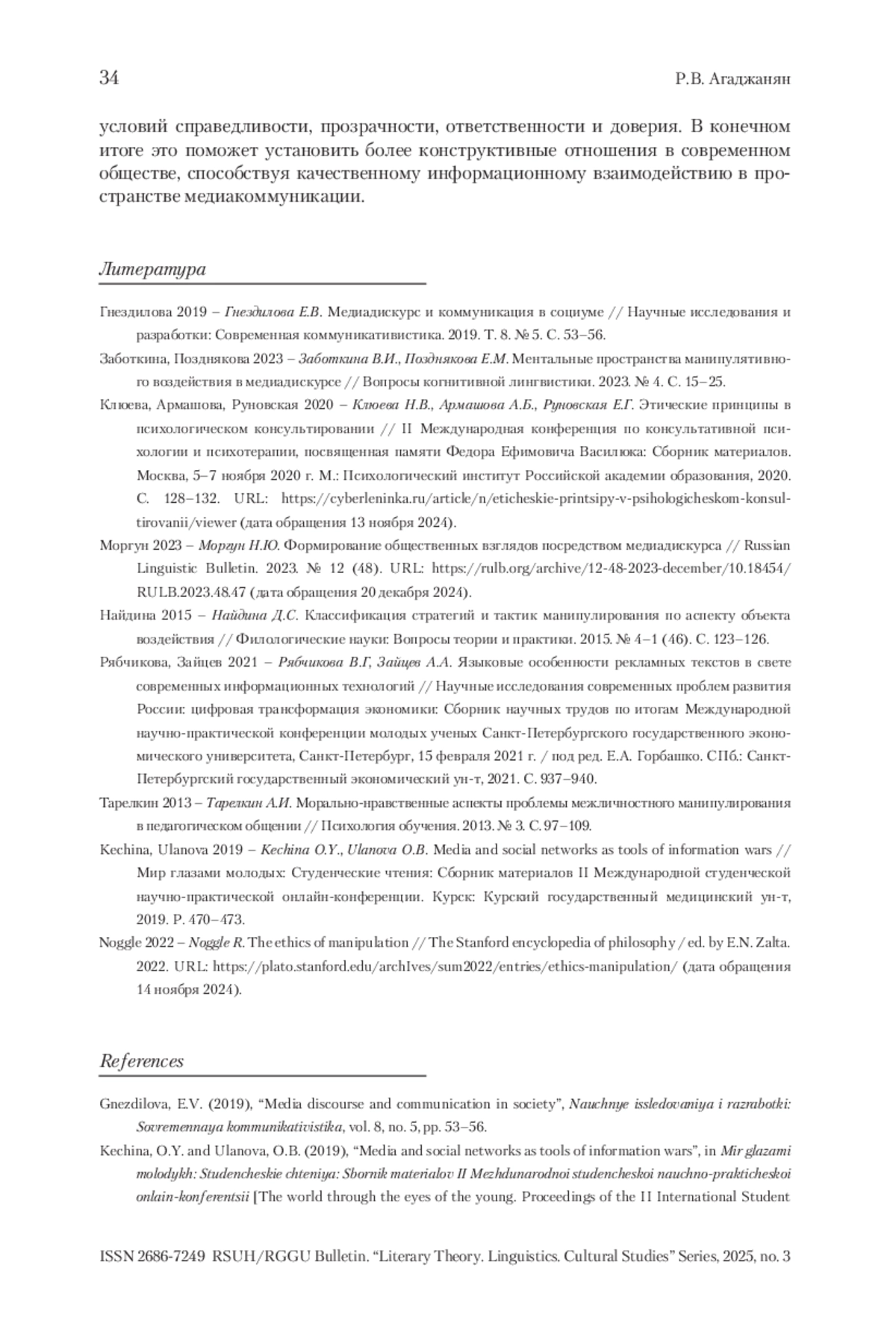4. Моргун 2023 - Моргун Н.Ю. Формирование общественных взглядов посредством медиадискурса // Russian Linguistic Bulletin. 2023. № 12 (48). URL: https://rulb.org/archive/12-48-2023-december/10.18454/RULB.2023.48.47 (дата обращения 20 декабря 2024).