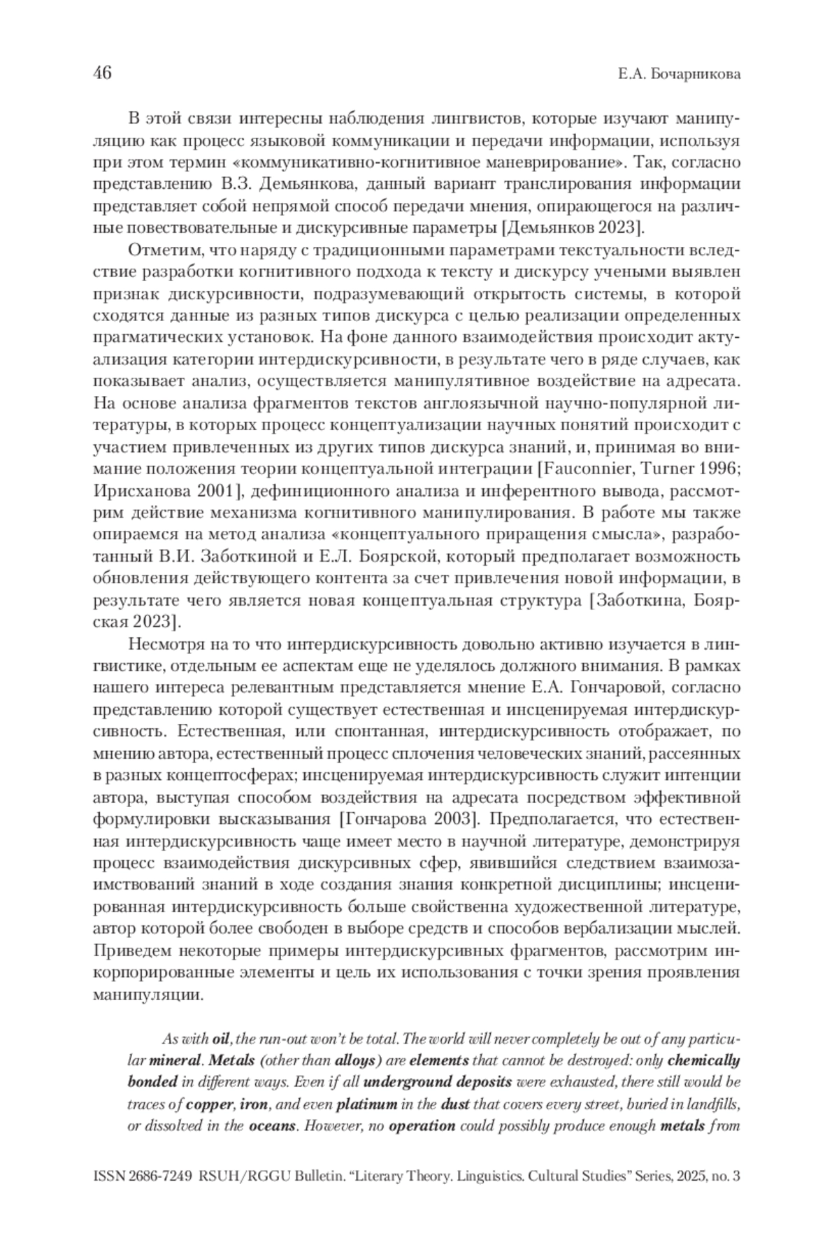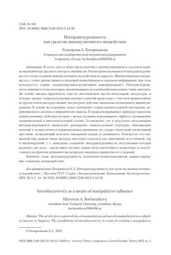 В статье дается общее представление о манипулировании и о речевом манипулировании как предмете интереса лингвистов. Рассмотрены возможности интердискурсивности в плане создания манипулятивного воздействия на адресата. Манипуляция рассматривается с точки зрения процесса языковой коммуникации и передачи информации; при этом используется термин «коммуникативно-когнитивное маневрирование». Интердискурсивность понимается как категория, проявляющаяся во взаимодействии разных типов дискурса. На основе анализа фрагментов текстов англоязычной научно-популярной литературы, в которых процесс концептуализации научных понятий происходит с участием привлеченных из других типов дискурса знаний, рассмотрено действие механизма когнитивного манипулирования. В основе исследования лежат положения теории концептуальной интеграции, дефиниционного анализа и инферентного вывода. В проанализированных примерах выявлены манипулятивные действия авторов с целью создания персуазивного эффекта, вызывающие эмоциональный и интеллектуальный отклик. Установлено, что в результате актуализации интердискурсивности происходит расширение концептуальной структуры описываемых понятий и осуществляется перекомпоновка признаков, что создает некоторый когнитивный диссонанс, позволяющий получить ожидаемый отклик от реципиента. Отмечается, что взаимодействие разных типов дискурса выступает сигналом как спонтанной, естественной, так и инсценируемой, т. е. намеренно созданной, интердискурсивности, актуализация которой реализует две цели – представить научное знание более масштабно и комплексно и способствовать восприятию реципиентом авторского видения и принятию его суждений.