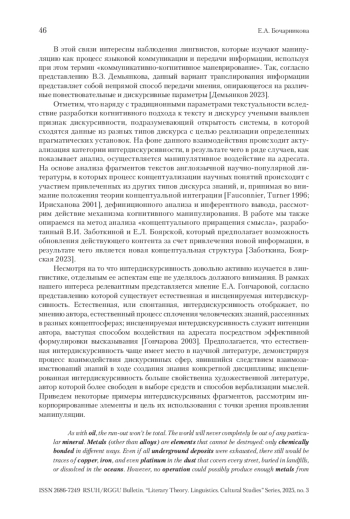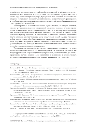 4. Заботкина 2023 - Заботкина В.И. Когнитивные механизмы смыслопорождения в дискурсе: манипулятивный аспект // Когнитивные исследования языка. Вып. 3 (54). 2023. С. 40-44.