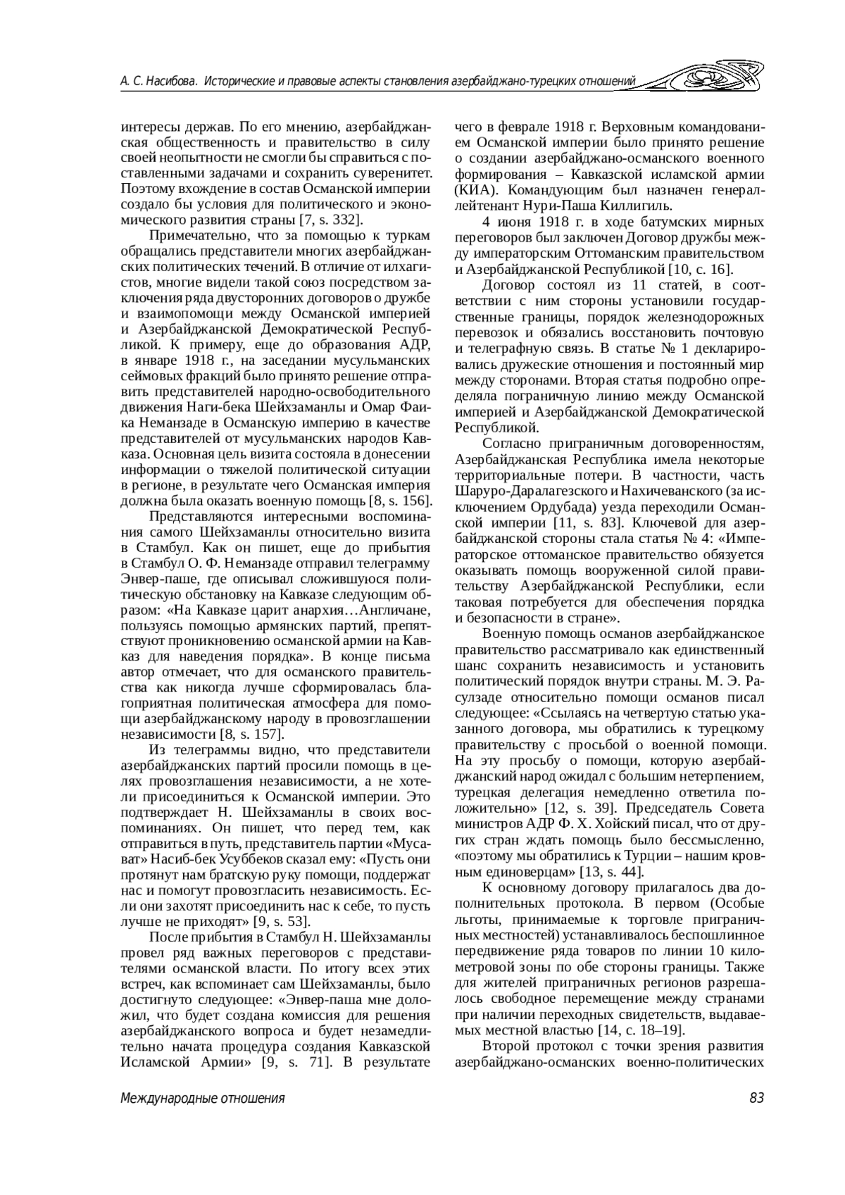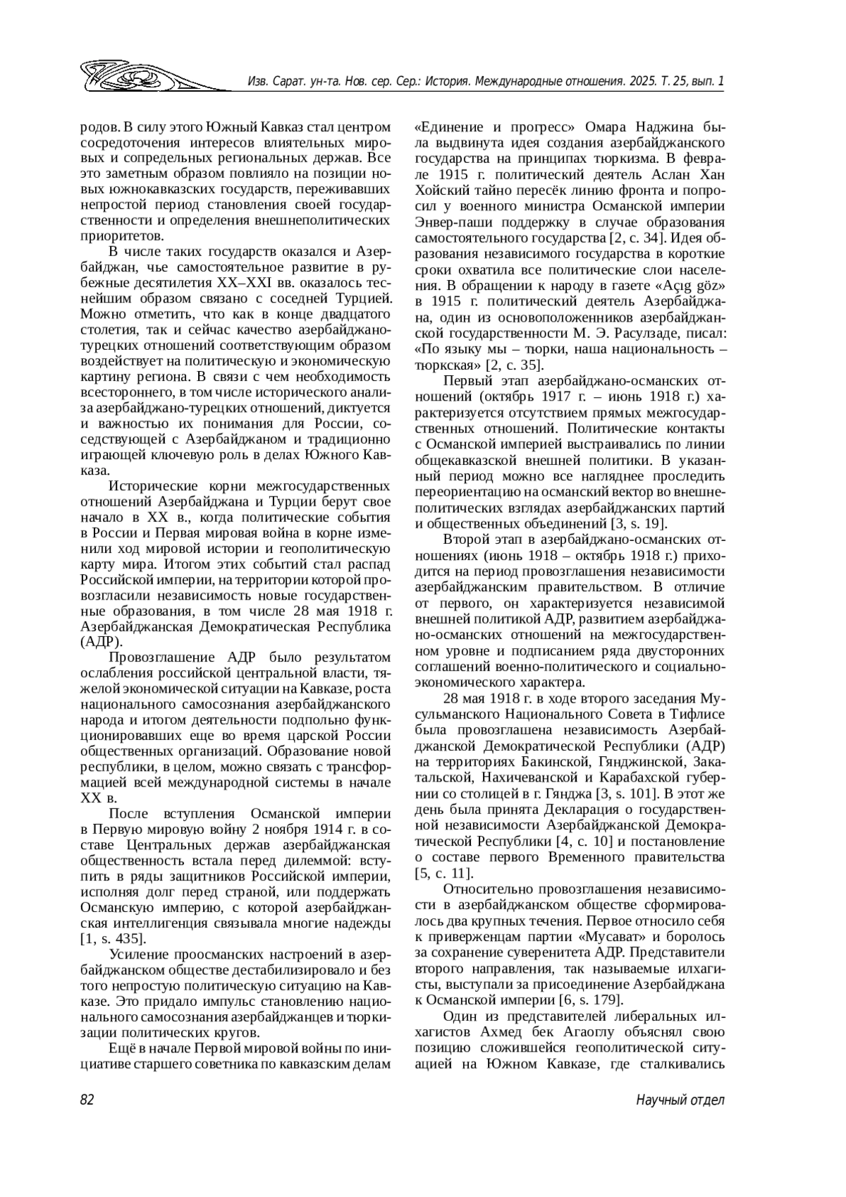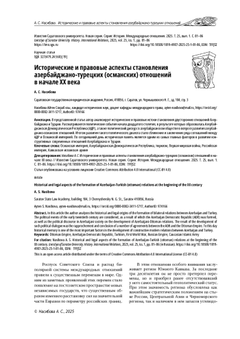 НАБИЕВА Й. С. ИСТОРИЧЕСКИЕ И ПРАВОВЫЕ АСПЕКТЫ СТАНОВЛЕНИЯ АЗЕРБАЙДЖАНО-ТУРЕЦКИХ (ОСМАНСКИХ) ОТНОШЕНИЙ В НАЧАЛЕ XX ВЕКА // ИЗВЕСТИЯ САРАТОВСКОГО УНИВЕРСИТЕТА. НОВАЯ СЕРИЯ. СЕРИЯ: ИСТОРИЯ. МЕЖДУНАРОДНЫЕ ОТНОШЕНИЯ. 2025. Т. 25 № 1