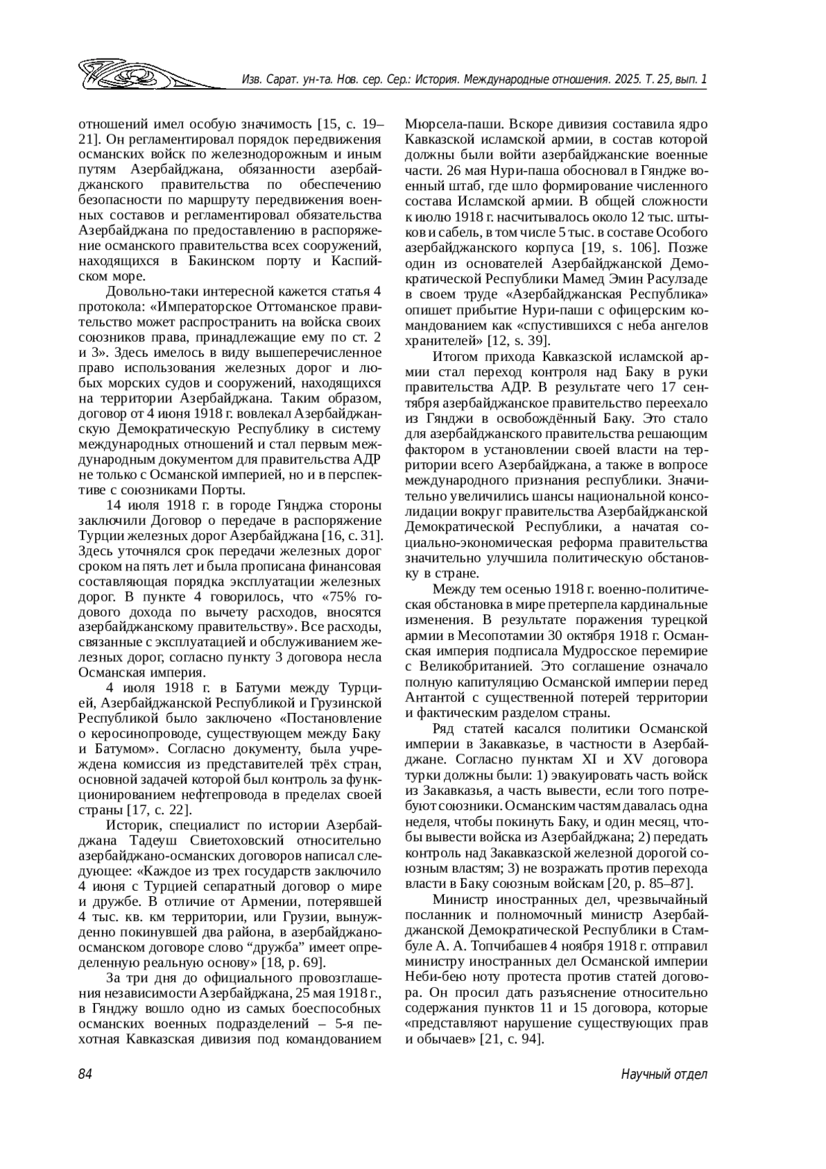 Статья: ИСТОРИЧЕСКИЕ И ПРАВОВЫЕ АСПЕКТЫ СТАНОВЛЕНИЯ АЗЕРБАЙДЖАНО-ТУРЕЦКИХ (ОСМАНСКИХ) ОТНОШЕНИЙ В НАЧАЛЕ XX ВЕКА (2025)