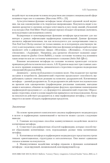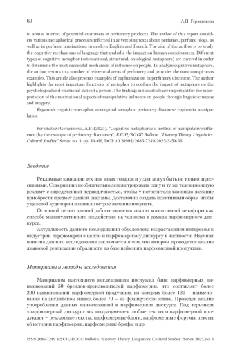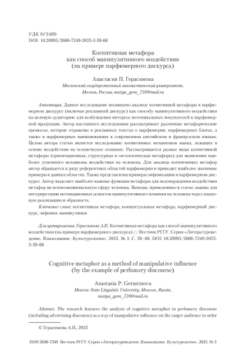 Данное исследование посвящено анализу когнитивной метафоры в парфюмерном дискурсе (включая рекламный дискурс) как способу манипулятивного воздействия на целевую аудиторию для возбуждения интереса потенциальных покупателей к парфюмерной продукции. Автор настоящего исследования рассматривает различные метафорические процессы, которые отражены в рекламных текстах о парфюмерии, парфюмерных блогах, а также в парфюмерных наименованиях в современном английском и французском языках. Целью автора статьи является исследование когнитивных механизмов языка, лежащих в основе воздействия на человеческое сознание. Рассматриваются разные виды когнитивной метафоры (ориентационная, структурная и онтологическая метафоры) для выявления наиболее успешного механизма воздействия на человека. Для анализа когнитивных метафор автор обращается к ряду референтных областей парфюмерии и приводит наиболее значимые примеры в данных областях. Также представлены примеры эвфемизации в парфюмерном дискурсе. Автор выделяет наиболее важные функции метафоры для подтверждения воздействия метафор на психоэмоциональную сферу человека. Выводы, приведенные в статье, важны для интерпретации мотивационных аспектов манипулятивного влияния на человека через языковую реализацию и образность.