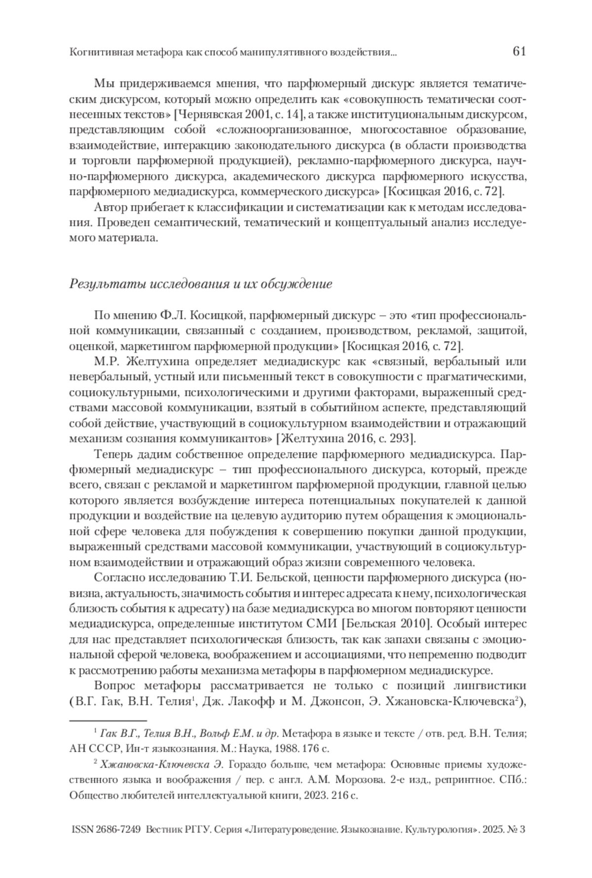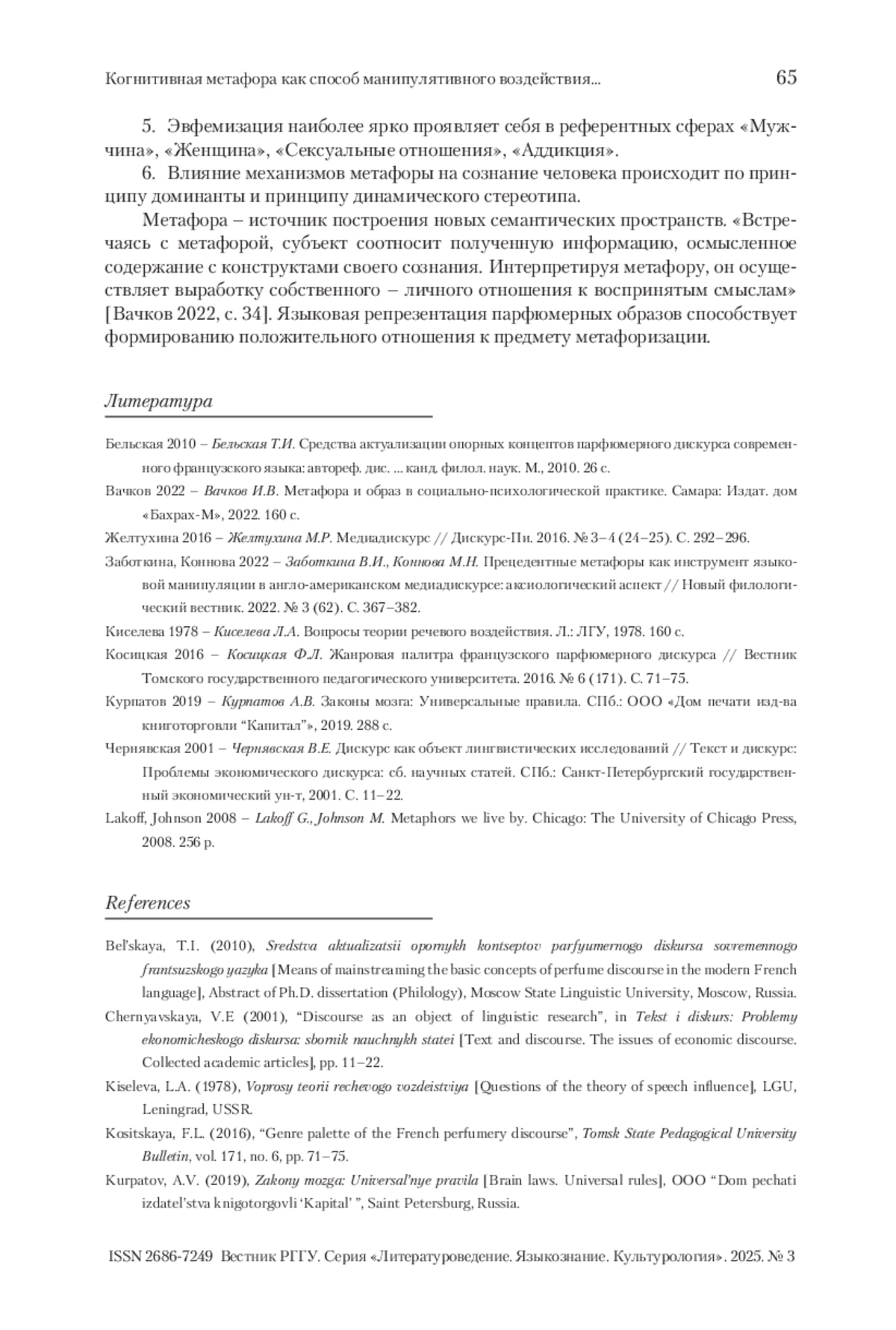 3. Желтухина 2016 - Желтухина М.Р. Медиадискурс // Дискурс-Пи. 2016. № 3-4 (24-25). C. 292-296. Заботкина, Коннова 2022 - Заботкина В.И., Коннова М.Н. Прецедентные метафоры как инструмент языковой манипуляции в англо-американском медиадискурсе: аксиологический аспект // Новый филологический вестник. 2022. № 3 (62). С. 367-382.